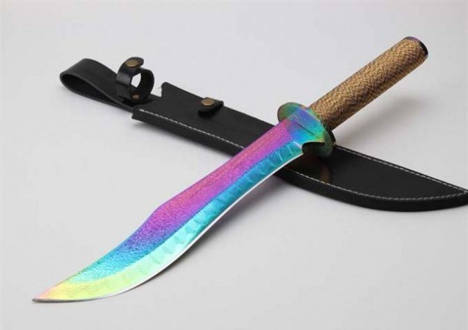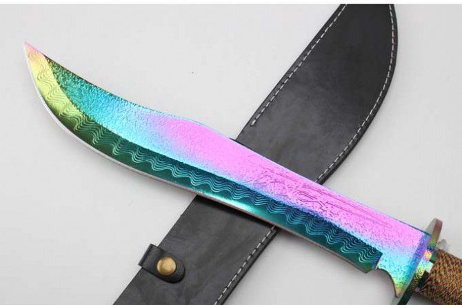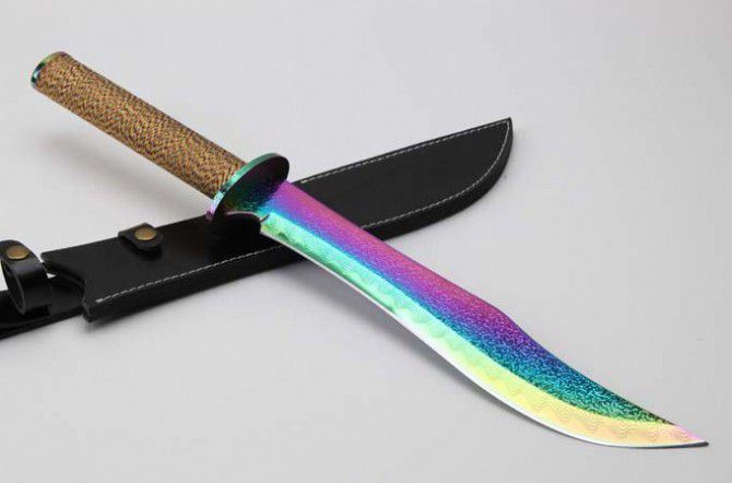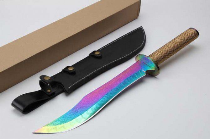 明朝总镖头大刀佩刀(彩钛版) 全 长: 57.6cm 刃 长: 36.3cm 柄 长: 21.2cm 刃 厚: 5.5mm 刃 宽: 5.6cm(最宽处) 刃 材: 420 硬 度: 57HRC 刀 重: 1399克(含包装) 表 面: 彩钛 柄 材: 钢+檀木防滑绳 结 构: 一体龙骨 刀 鞘: 牛皮套 +纸盒