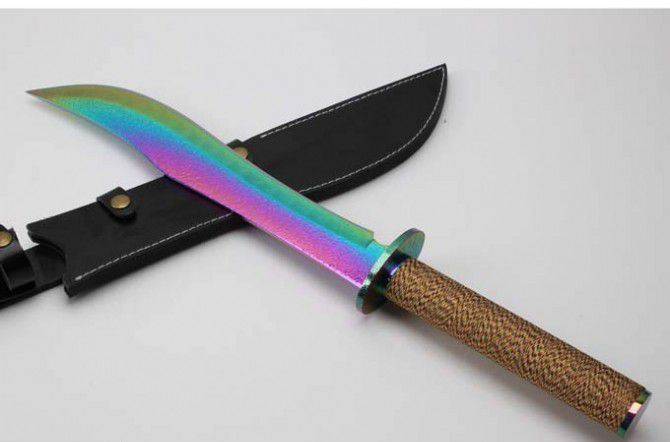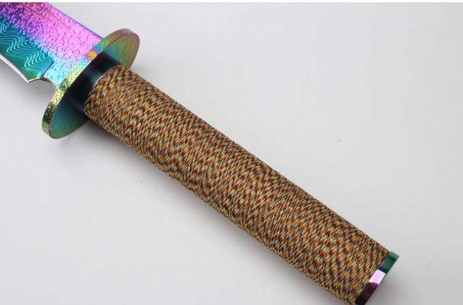 明朝总镖头大刀佩刀(彩钛版) 全 长: 57.6cm 刃 长: 36.3cm 柄 长: 21.2cm 刃 厚: 5.5mm 刃 宽: 5.6cm(最宽处) 刃 材: 420 硬 度: 57HRC 刀 重: 1399克(含包装) 表 面: 彩钛 柄 材: 钢+檀木防滑绳 结 构: 一体龙骨