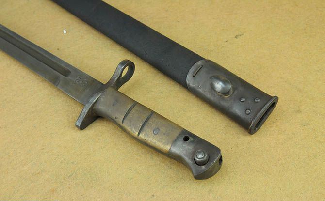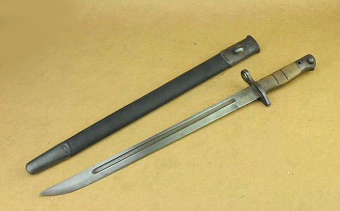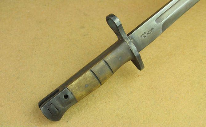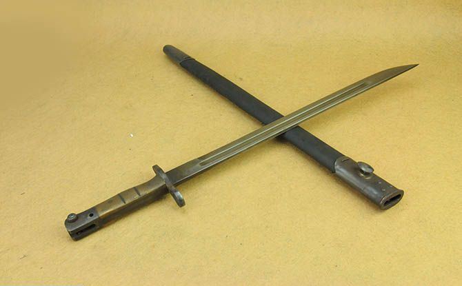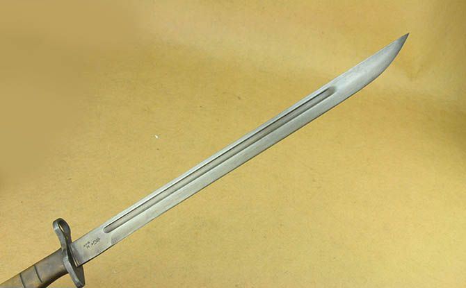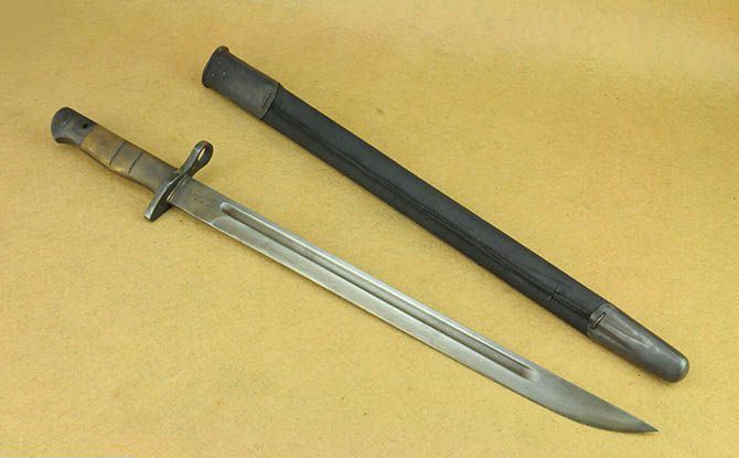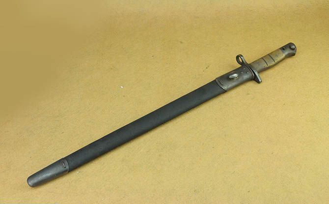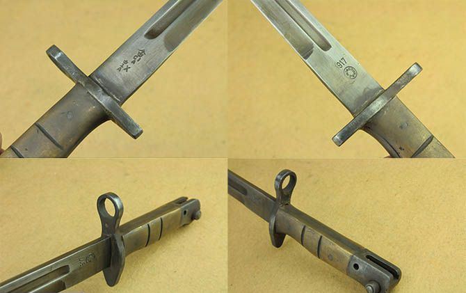 雷明顿1917军刺老刀(古董) 刀全长:51cm 刃 长:38.5cm 刀柄长:12.5cm 刃 宽:2.5cm 刃 厚:6.6cm 重 量:880克 材 质:不明确 硬 度:不明确 柄 材:黄铜 刀 鞘:皮包铁 新旧程度:7成新 其他说明:刀身正面刻“1917”和“REMINGTON” 这个是雷明顿的英文;背面为厂家的生产标识。