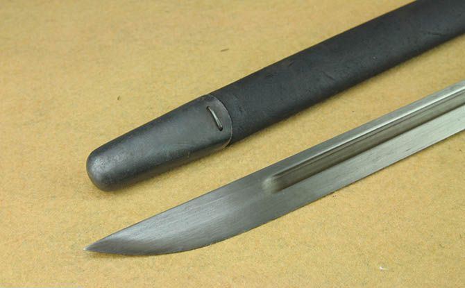 刀全长:51cm 刃 长:38.5cm 刀柄长:12.5cm 刃 宽:2.5cm 刃 厚:6.6cm 重 量:880克 材 质:不明确 硬 度:不明确 柄 材:黄铜 刀 鞘:皮包铁 新旧程度:7成新