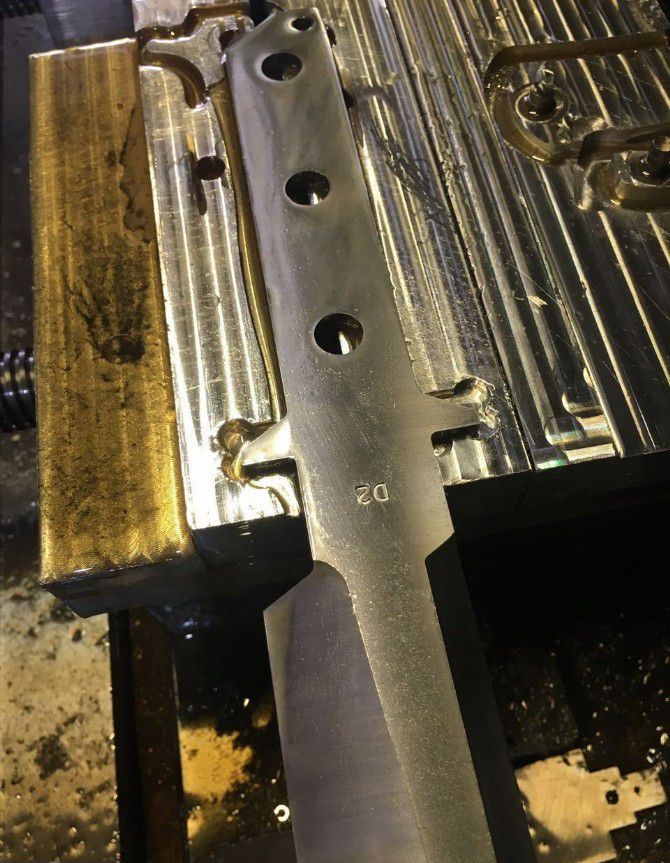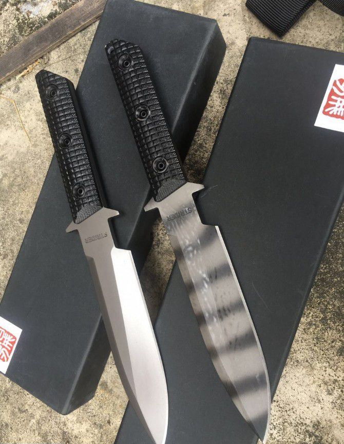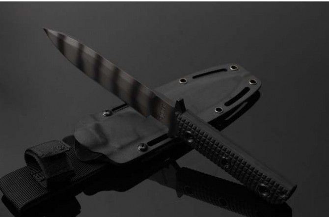 百炼硬汉终结者(迷彩虎纹、镀钛) 全 长:290mm 刃 长:150 mm 柄 长:118mm 刃 宽:33.1mm 刃 厚:6.0mm 锁 型:定锁 开刃方式:二次开刃 刃 材: 一胜百D2钢材 热处理方式:真空淬油深冷热处理 硬 度:不低于58-60HRC 柄 材:黑色G10 净 重:550克(不含包装) 刀 鞘:K鞘 类 型: 以锋利度.韧性保持度.砍削最出色,超强立体感刃线 包 装: 精美黑纸盒 其 他:配硬纸盒+进口K鞘