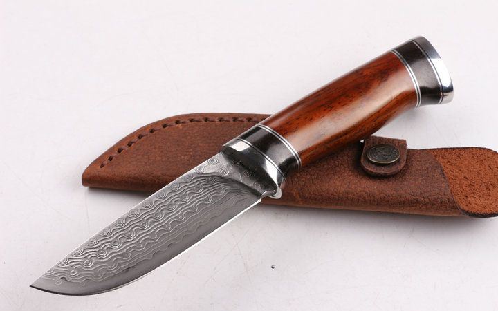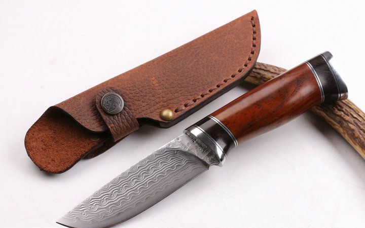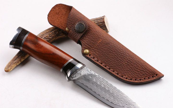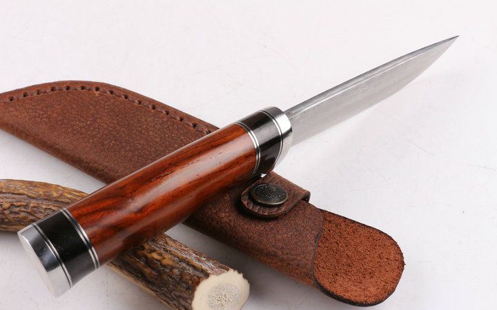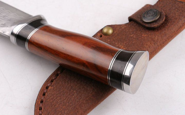 执政者大马士革小猎刀 全 长: 21cm 刃 长: 10cm 柄 长: 11.2cm 刃 厚: 4.1mm 刃 材: 大马士革 硬 度: 58HRC 总 重: 480克 净 重: 170克 表 面: 大马士革原有花纹 柄 材: 钢头+天然红檀木+纯黑牛角 刀 鞘: 皮套
