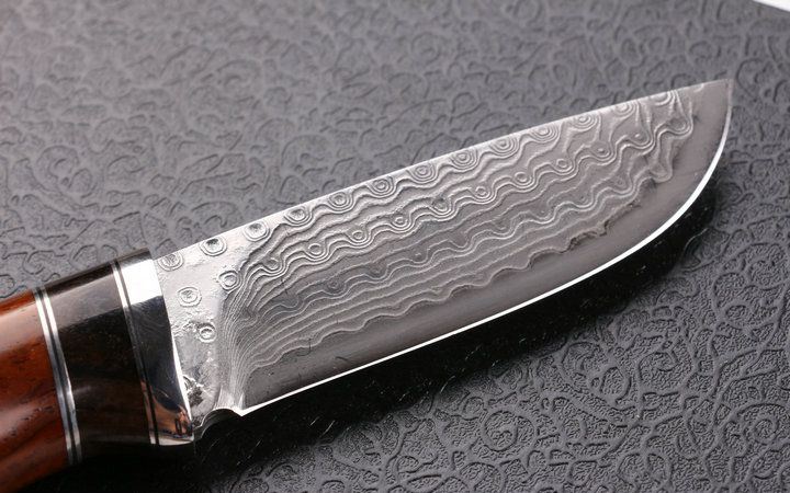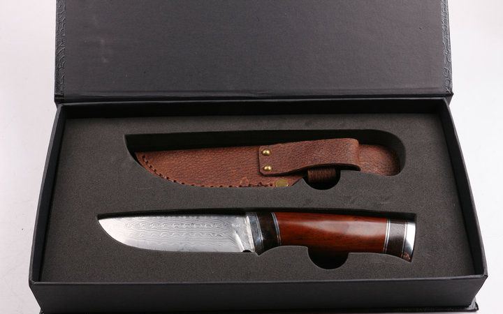执政者大马士革小猎刀 全 长: 21cm 刃 长: 10cm 柄 长: 11.2cm 刃 厚: 4.1mm 刃 材: 大马士革 硬 度: 58HRC 总 重: 480克 净 重: 170克 表 面: 大马士革原有花纹 柄 材: 钢头+天然红檀木+纯黑牛角 刀 鞘: 皮套 其 它: 刀口锋利,手工制作,值得收藏