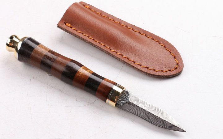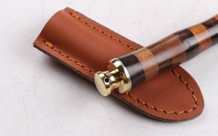 至尊大马士革茶刀 全 长: 15.8cm 刃 长: 5.5cm (无开刃) 刃 宽: 1.5cm(最宽处) 柄 长: 10.2cm 硬 度: 59HRC 刃 厚: 0.4cm 重 量: 75 克(含包装) 表 面: 纯手工制造 刃 材: 大马士革 柄 材: 黄铜头+天然黑檀木+科檀木相间接在一起,所用的材料都经过名刀匠精选过的,不是其它垃圾茶刀. 其 他: 配白盒+真皮套,大马士革钢花纹和把手木纹及颜色各异,以实物为准