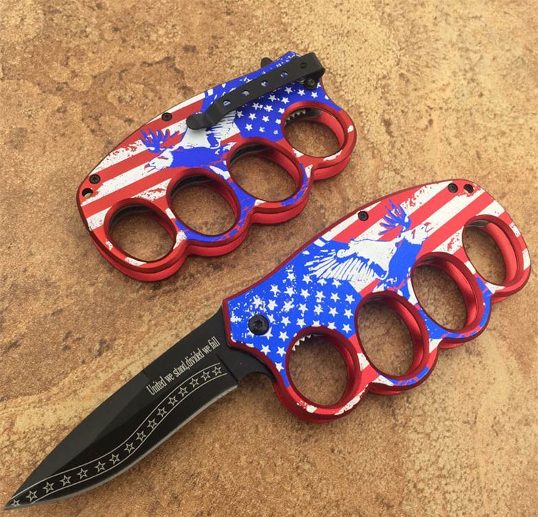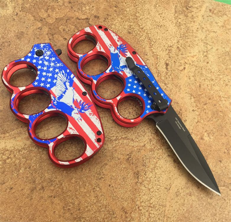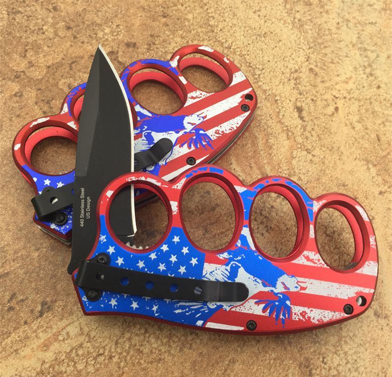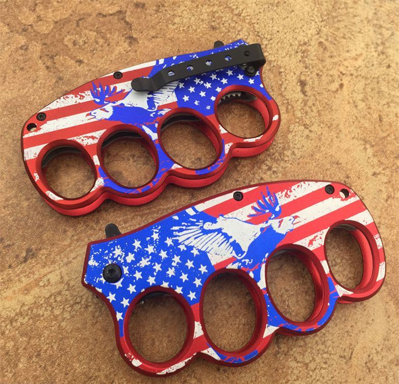SDS美国旗拳套折刀(助力款) 全长:21CM 刀刃长:9CM 刀柄(拳套)长:12CM 款 6.5CM 刃材料:3铬13不锈钢 柄材:钢架+铝合金