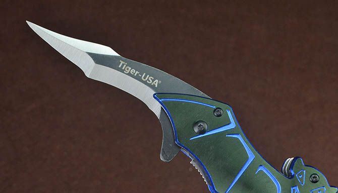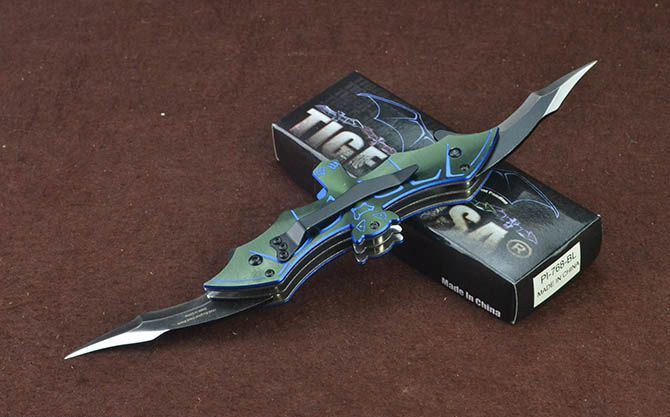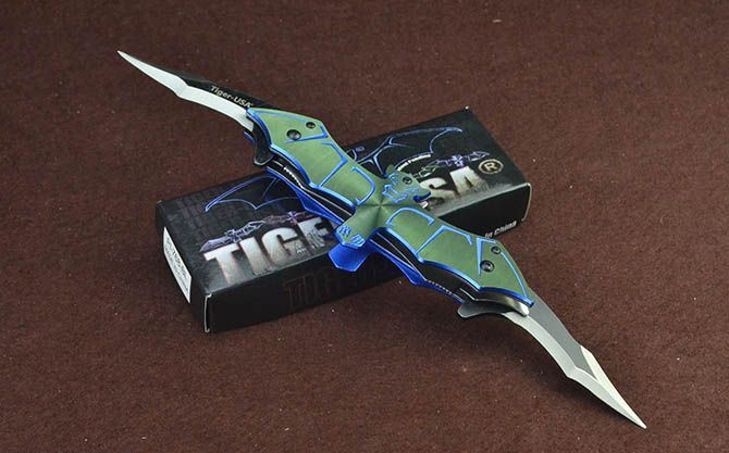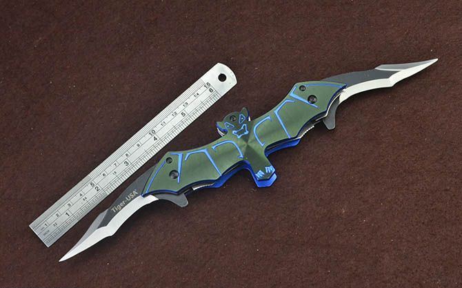 双开蝙蝠折刀(绿刃) 打开全长: 28cm 刃 长: 7cm 刃 宽: 2cm 闭 合: 15cm 刃 材: 440 硬 度: 55 刃 面: 发黑+拉丝 刃 厚: 2.7cm 柄 长: 15cm 柄 材: 合金铝 毛 重: 207克(含包装) 锁 闭: 线锁 包 装: 彩盒