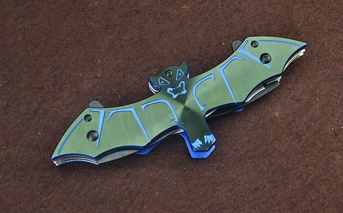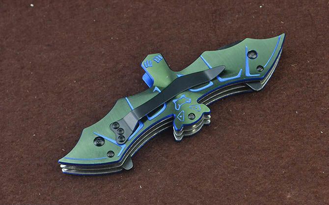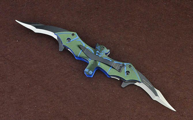 双开蝙蝠折刀(绿刃) 打开全长: 28cm 刃 长: 7cm 刃 宽: 2cm 闭 合: 15cm 刃 材: 440 硬 度: 55 刃 面: 发黑+拉丝 刃 厚: 2.7cm 柄 长: 15cm 柄 材: 合金铝 毛 重: 207克(含包装) 锁 闭: 线锁 包 装: 彩盒 备 注: 带腰夹