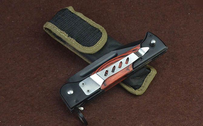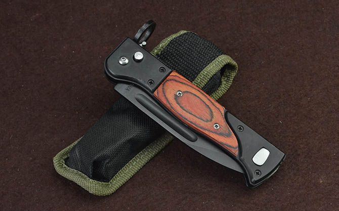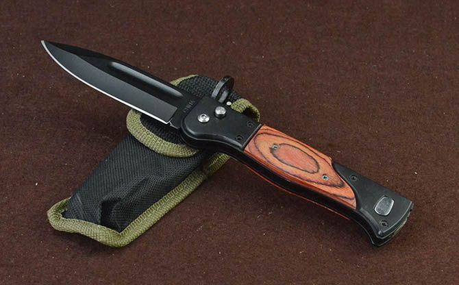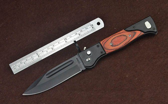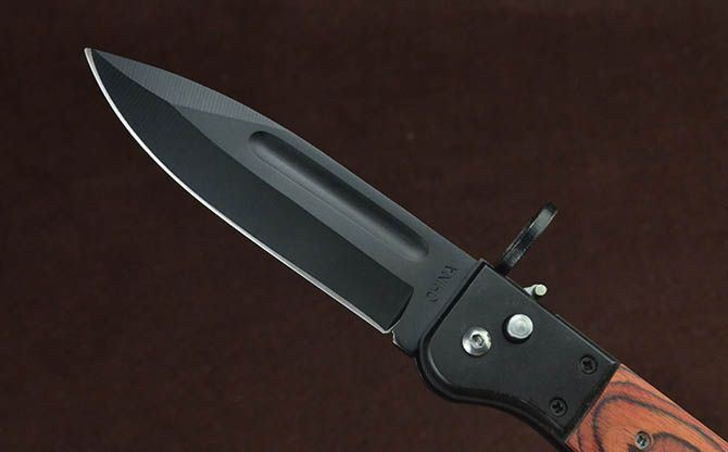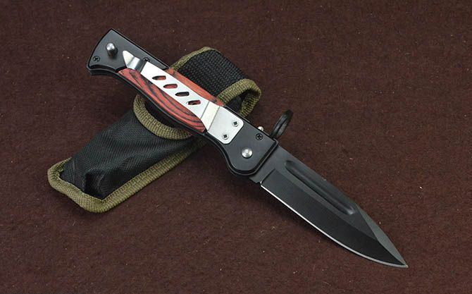 黑版AK-47枪刺弹簧刀(小号) ◇全 长:23.5cm ◇刃 长:9.8cm ◇柄 长:13cm ◇刃 宽:2.8cm(最宽处) ◇刃 厚:3mm ◇刃 材:3cr13 ◇硬 度:55HRC ◇刀 柄:双钢头+彩木片 ◇表 面:黑色 ◇重 量:238克 ◇备 注:带尼龙套