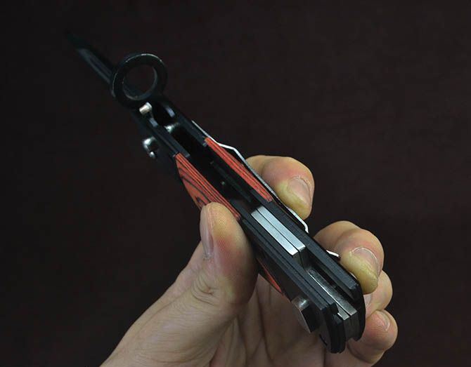 黑版AK-47枪刺弹簧刀(小号) ◇全 长:23.5cm ◇刃 长:9.8cm ◇柄 长:13cm ◇刃 宽:2.8cm(最宽处) ◇刃 厚:3mm ◇刃 材:3cr13 ◇硬 度:55HRC ◇刀 柄:双钢头+彩木片 ◇表 面:黑色 ◇重 量:238克 ◇备 注:带尼龙套 ◇锁 闭:弹簧安全锁