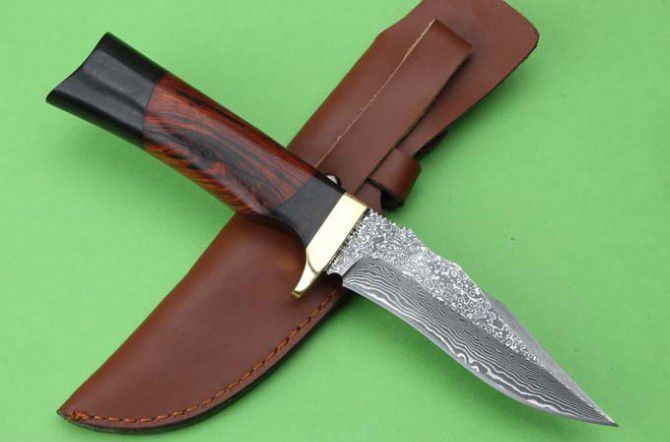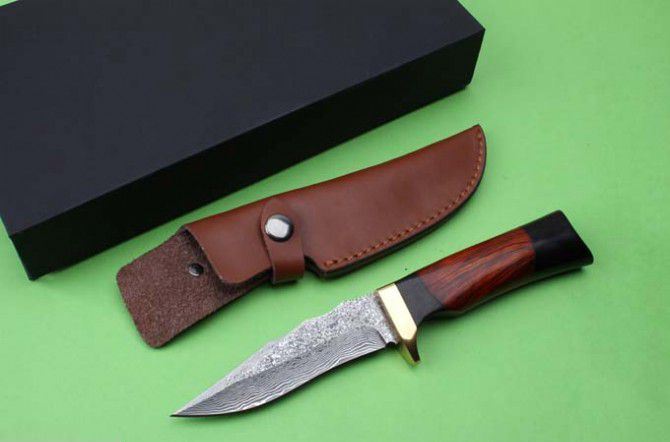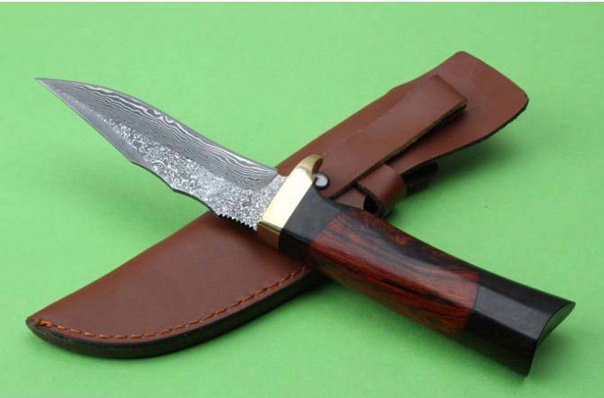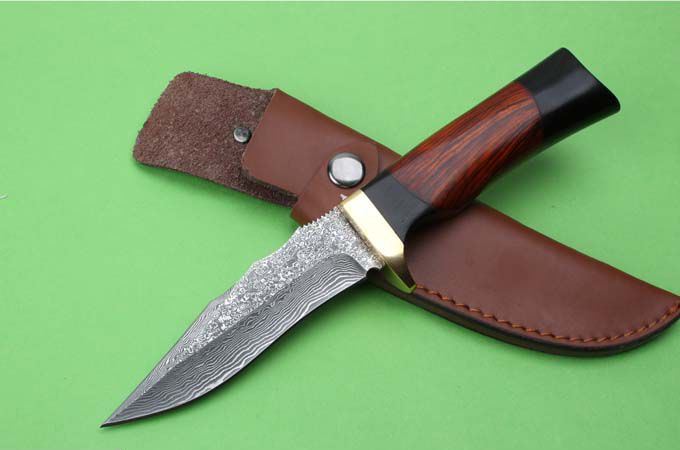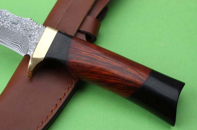 托马斯大马士革雪鹰猎刀 全 长: 23.8 cm 刃 长: 11.5 cm 柄 长: 12.0 cm 刃 宽: 3.0 cm(最宽处) 刃 厚: 0.3cm 柄 材: 铜头+黑檀和红梨木 刃 材: 进口大马士革钢 重 量: 476g含包装 其 他: 普通礼盒,头层优质牛皮套
