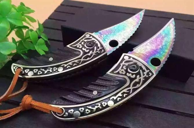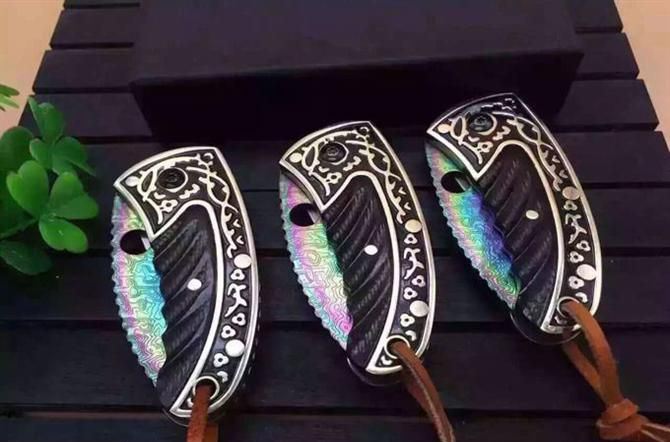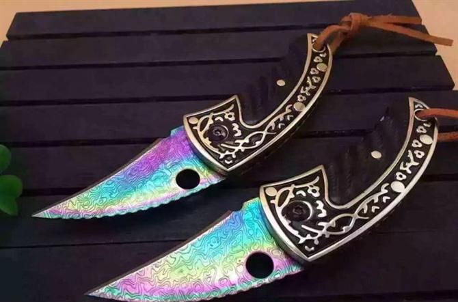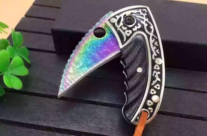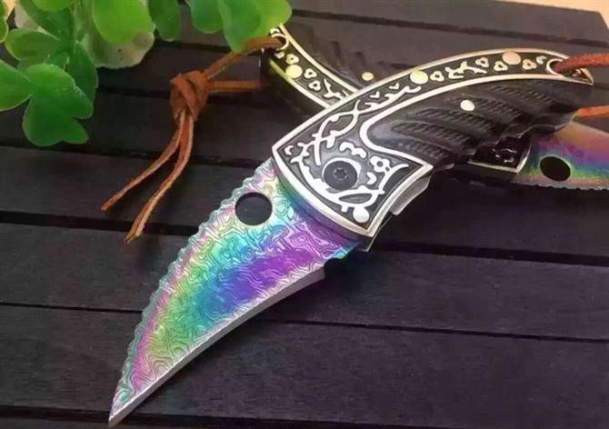 大马士革小老鼠刀(彩虹渡钛) 全 长:11.7cm 刃 长:4.5cm 刃 宽:2.5cm(最宽处) 柄 长:7cm 刃 厚:2.5mm 刃 材:大马士革 柄 材:铜头雕花+黑檀木柄片 硬 度:59HRC 表 面:大马士革原色花纹 重 量:79克(含包装) 锁 闭:线锁 包 装:皮条,高档纸盒