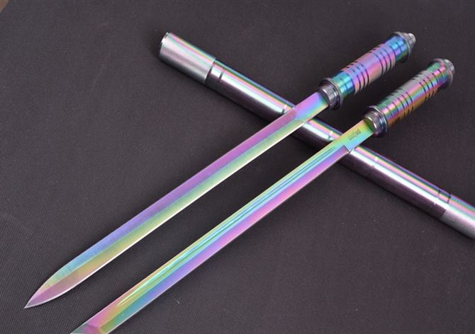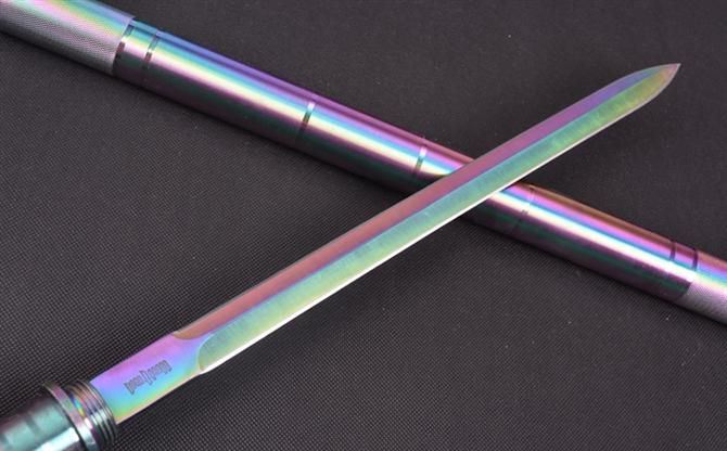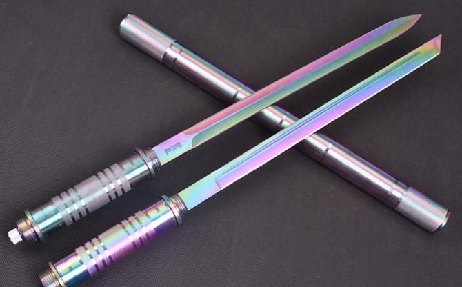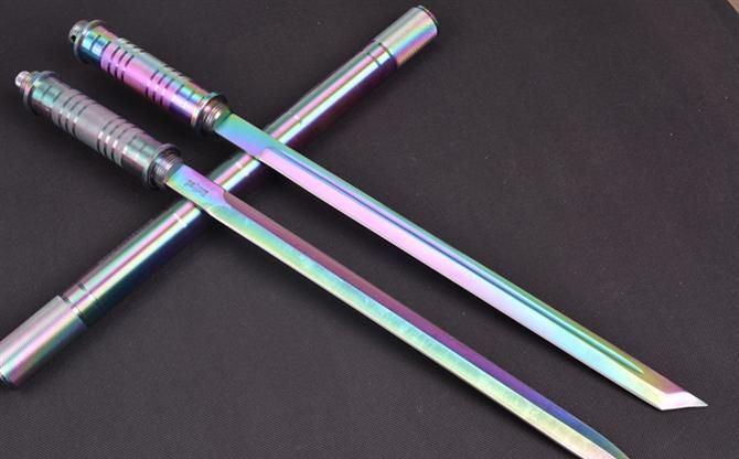 幻影带灯棍刀(彩钛) 完全反接长度:95.5CM 完全正合长度:57.5CM 刃长:39CM 刀厚:0.46CM 刃宽: 2.2CM 管径:3.2CM 重量: 1000g 硬度: 56HRC 刀材质:5Cr13Wov 管材: 铝管 柄材: 合金
