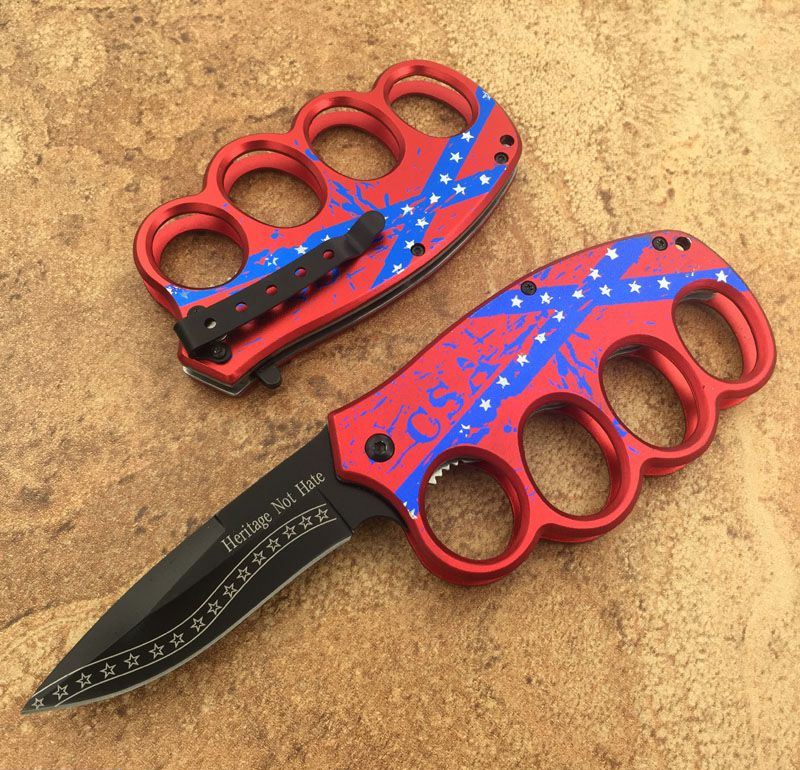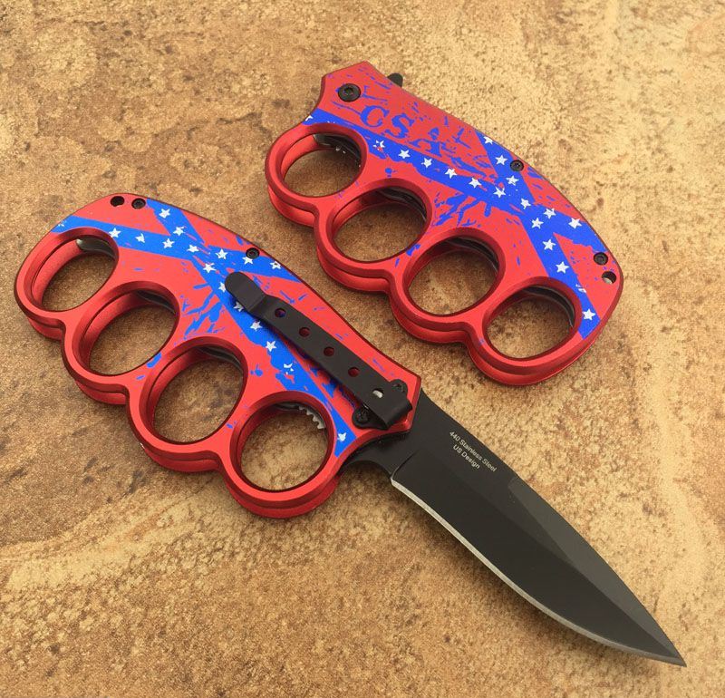DIXIE美国联盟旗拳套折刀(助力) 全长:21CM 刀刃长:9CM 刀柄(拳套)长:12CM 柄长:6.5CM 刃材料:3铬13不锈钢 柄材:钢架+铝合金