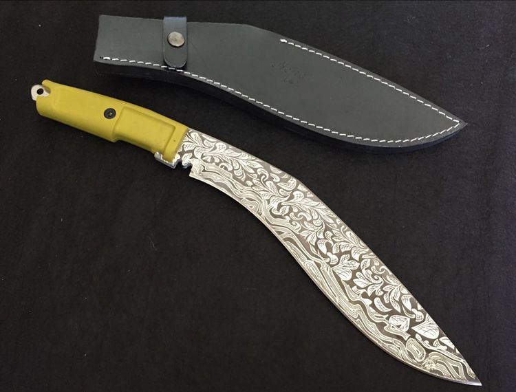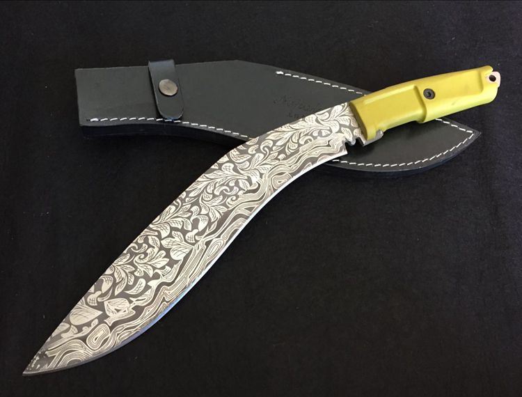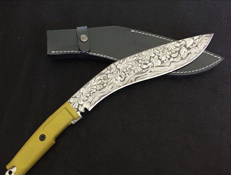 尼泊尔暴龙花纹狗腿刀 全长:42.5cm 刀刃:29cm 刃厚:0.6cm 刃宽:5.3CM 柄长:12.5cm 柄材:橡胶 硬度:57HRC 毛重:974克(含皮套) 表面处理:纯手工锻造