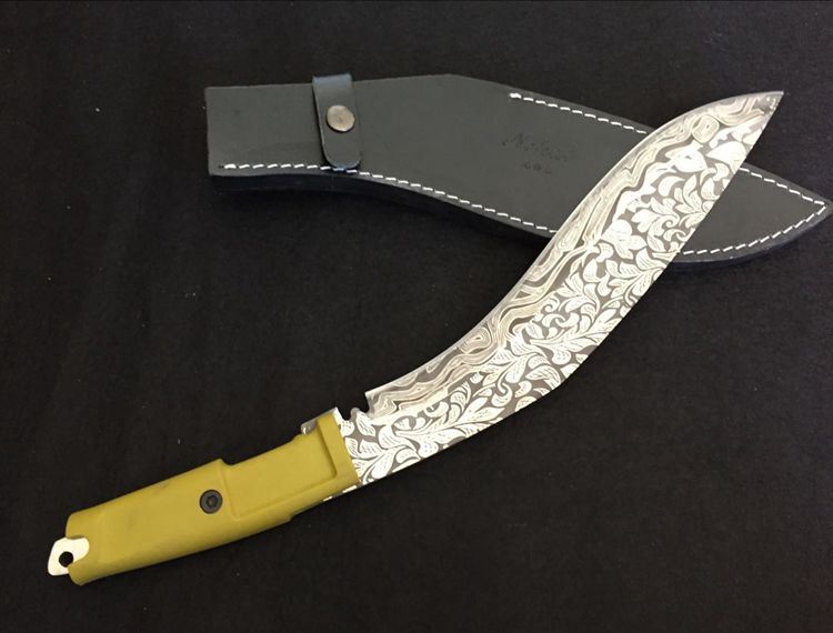 尼泊尔暴龙花纹狗腿刀 全长:42.5cm 刀刃:29cm 刃厚:0.6cm 刃宽:5.3CM 柄长:12.5cm 柄材:橡胶 硬度:57HRC 毛重:974克(含皮套) 表面处理:纯手工锻造 结构:龙骨结构,刀身贯穿刀柄,非常牢固 、皮鞘、纸盒