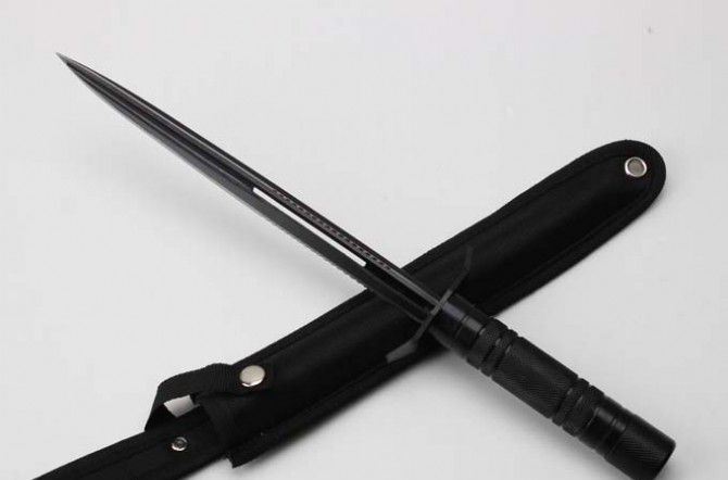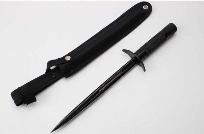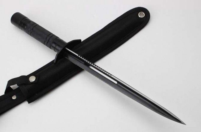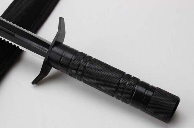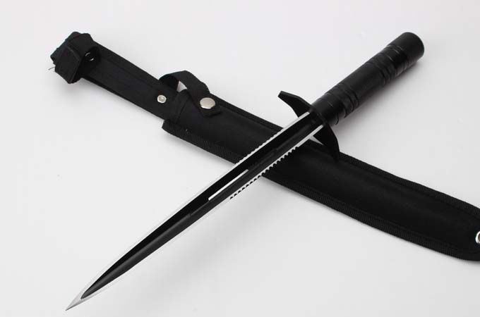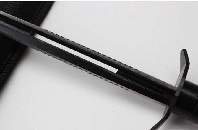 新版钢铁三棱带齿(只供收藏) 长 度:36.5CM 刃 长:23.7CM 重 量:330g 硬 度:53HRC 刀材质:不锈钢 柄 材:钢 表面处理:电泳黑化 其他:尼龙刀套