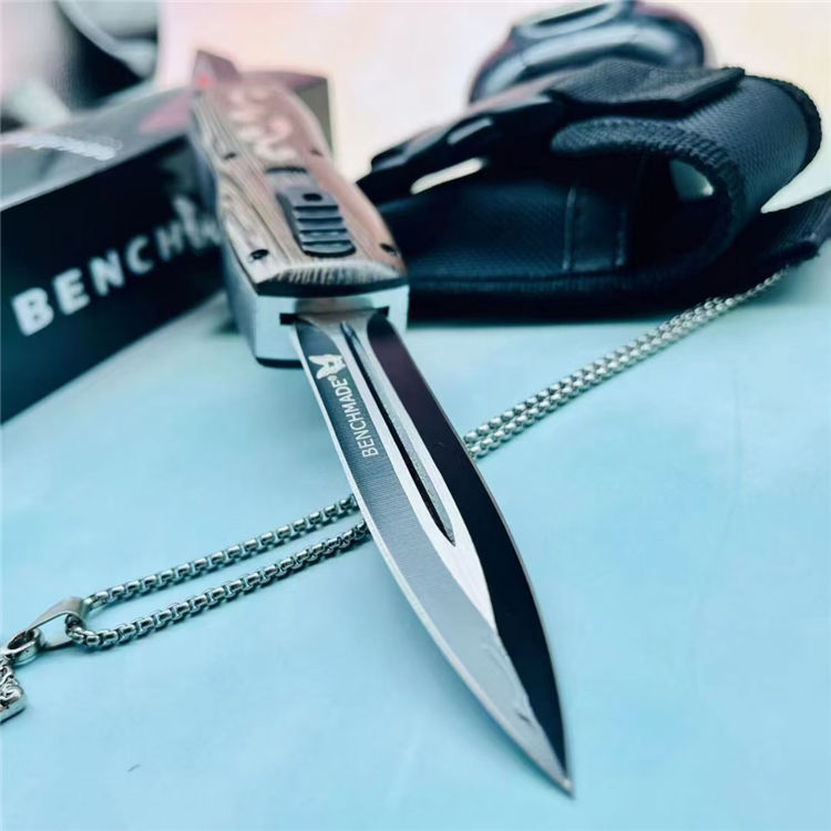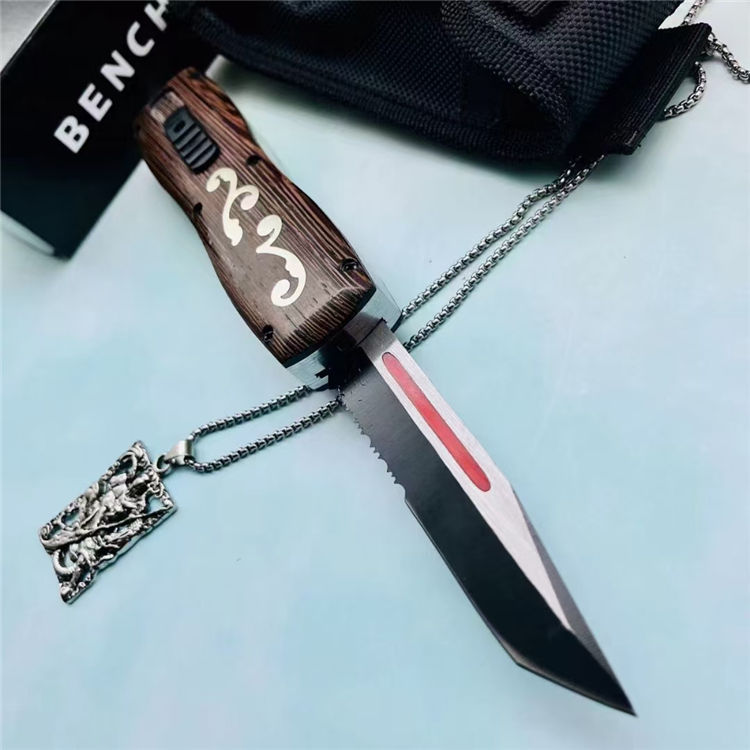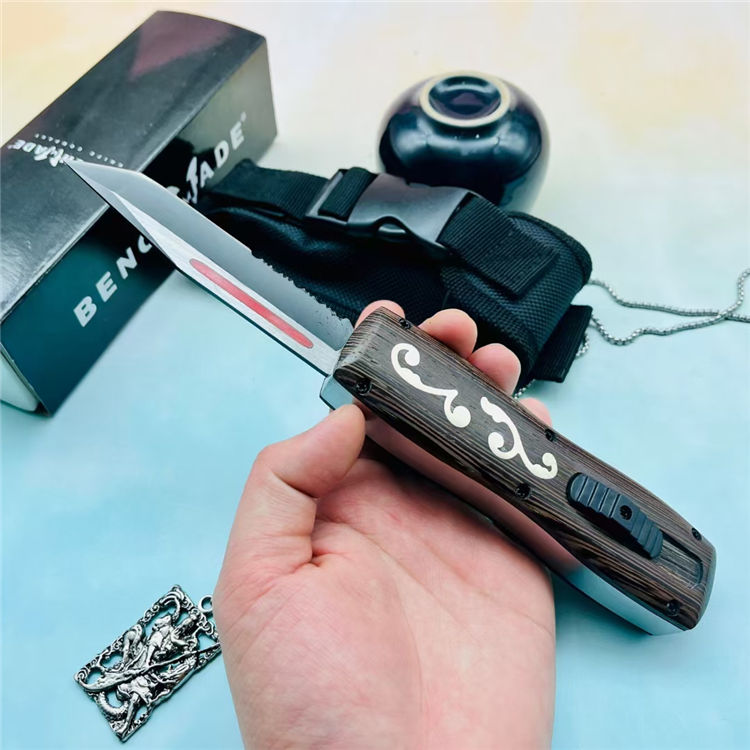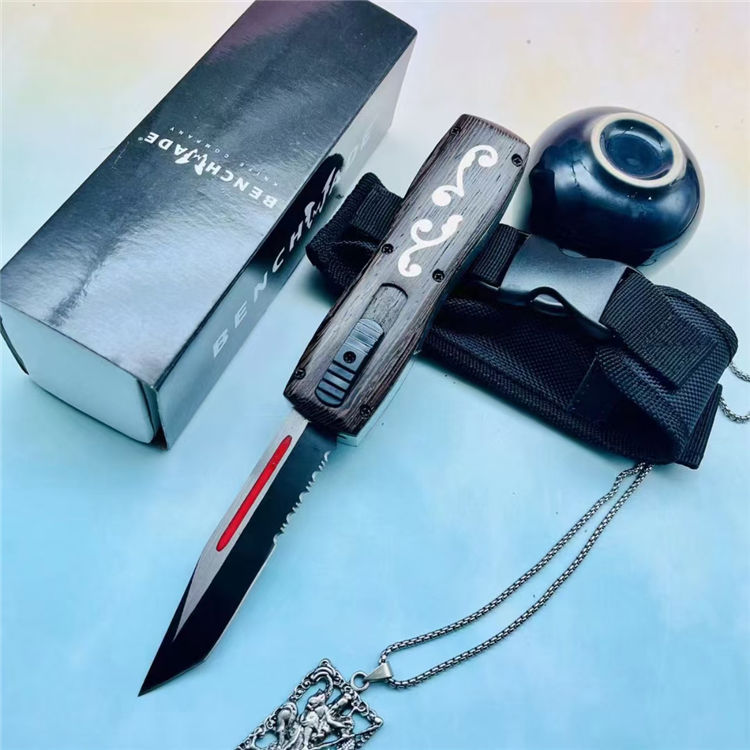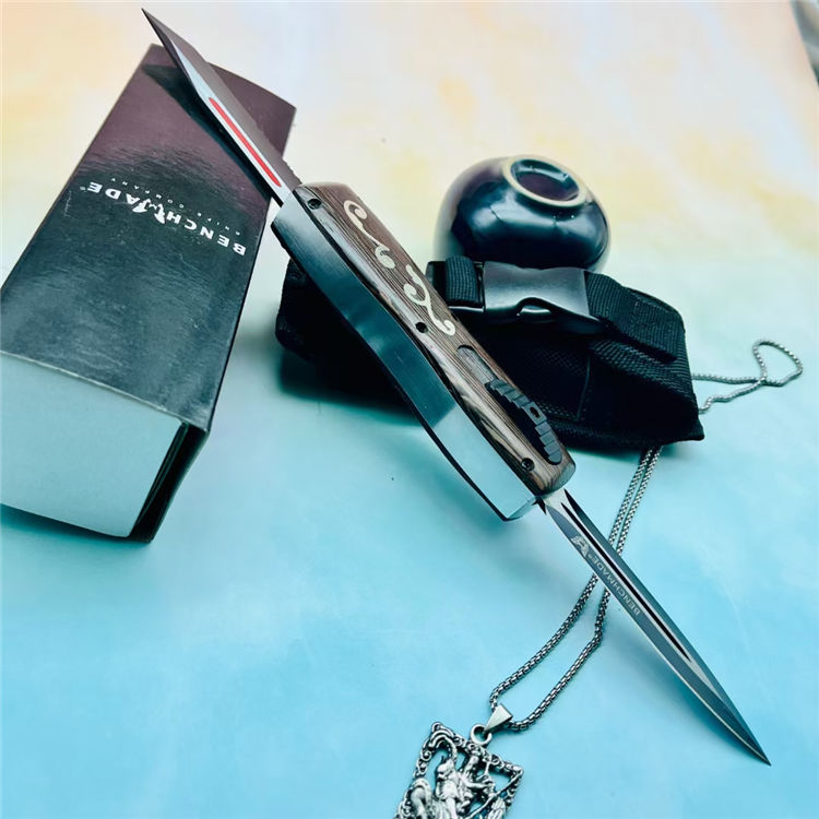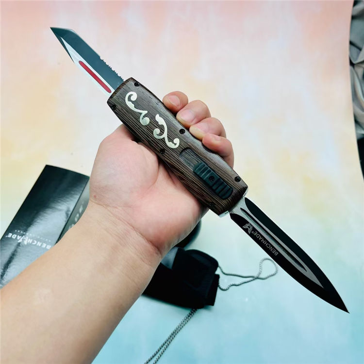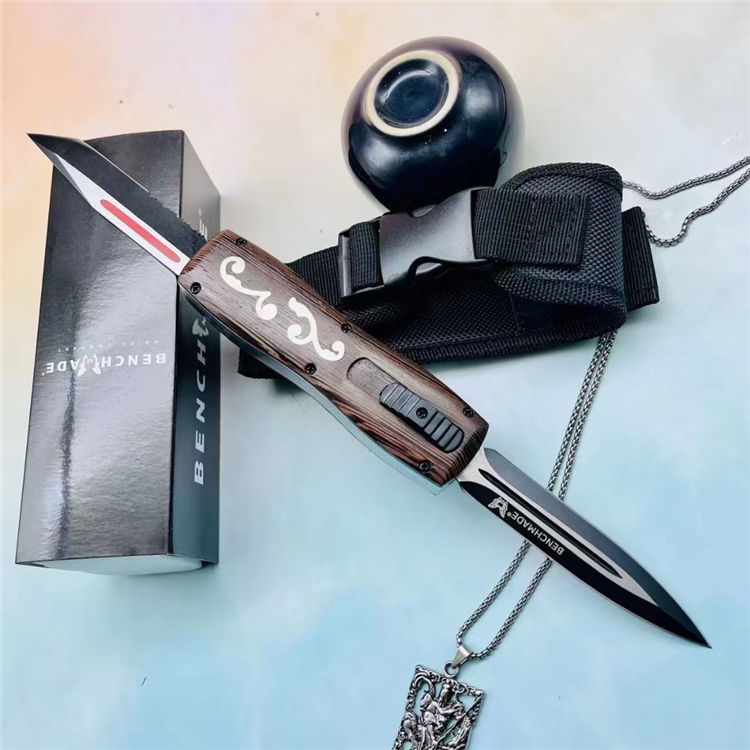 猛兽蝴蝶刀(双刀) 全 长:22.0cm 刃 长:9.3cm 刃 厚:2.2mm 刃 材:D2 硬 度:59HRC 刀 重:283g 毛 重:364g 表 面:镀钛 柄 材:锌铝合金+豹纹木 刀 鞘:尼龙 锁 闭:直出弹簧刀(双刀)