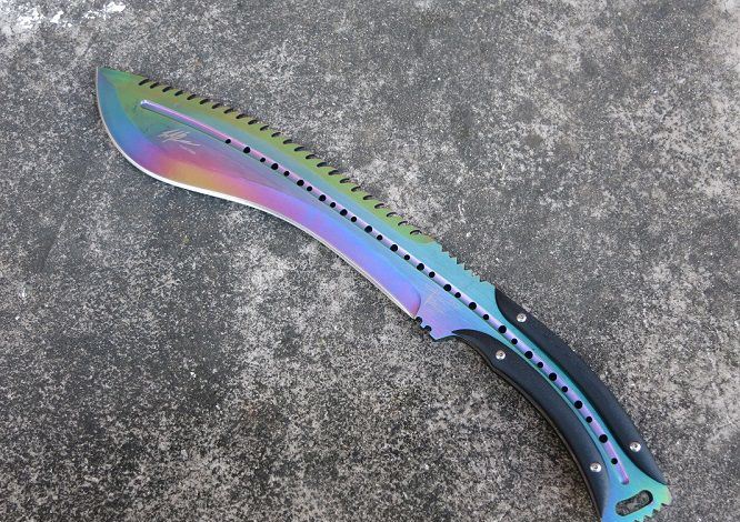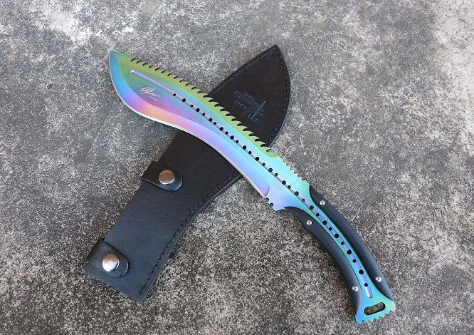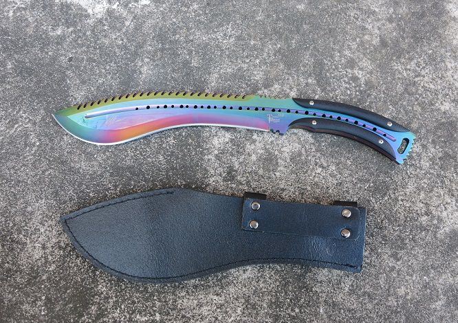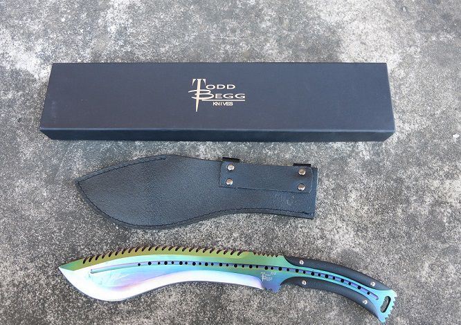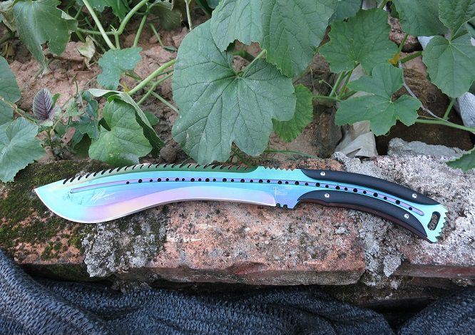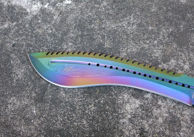 大号托德征服者狗腿刀(彩钛背齿) 全 长:39cm 刃 长:24cm 刃 宽:6cm(最宽处) 刃 厚:6.2mm 柄 长:13cm 表 面:彩钛 刃 材:5Cr15 硬 度:58HRC 柄 材:G10防滑柄片 结 构:龙骨一体贯穿整体 重 量:800克(含包装) 包 装:皮套+彩盒