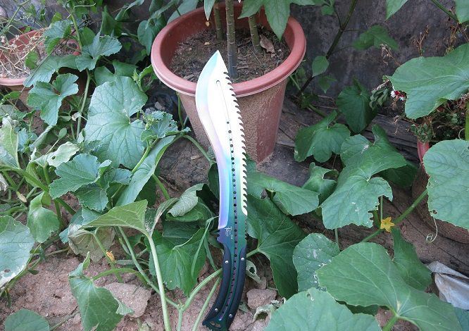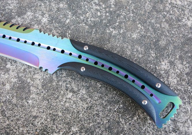 大号托德征服者狗腿刀(彩钛背齿) 全 长:39cm 刃 长:24cm 刃 宽:6cm(最宽处) 刃 厚:6.2mm 柄 长:13cm 表 面:彩钛 刃 材:5Cr15 硬 度:58HRC 柄 材:G10防滑柄片 结 构:龙骨一体贯穿整体 重 量:800克(含包装)