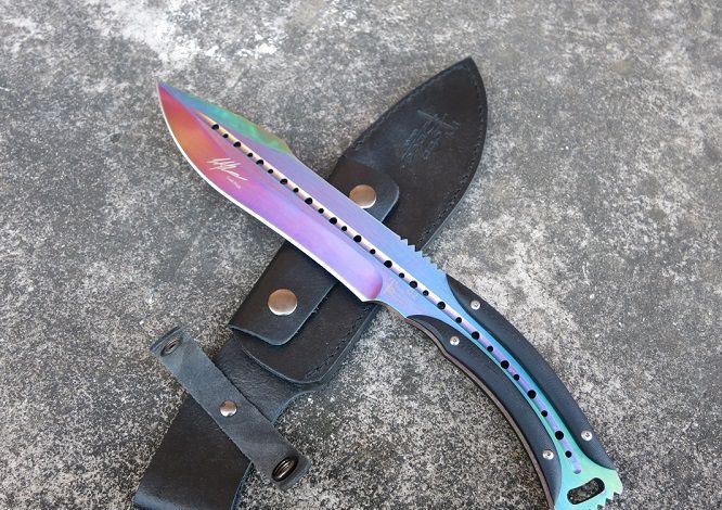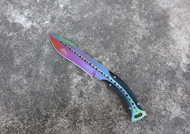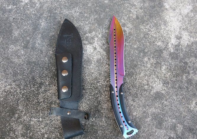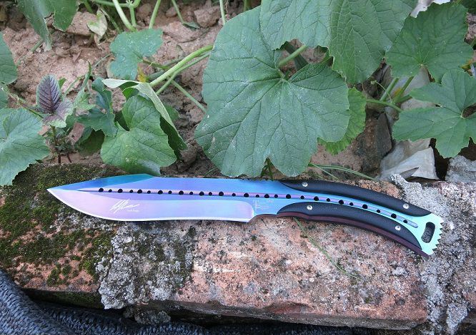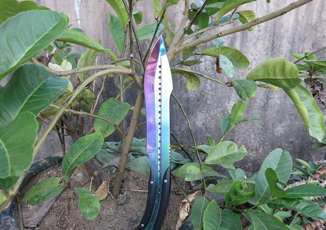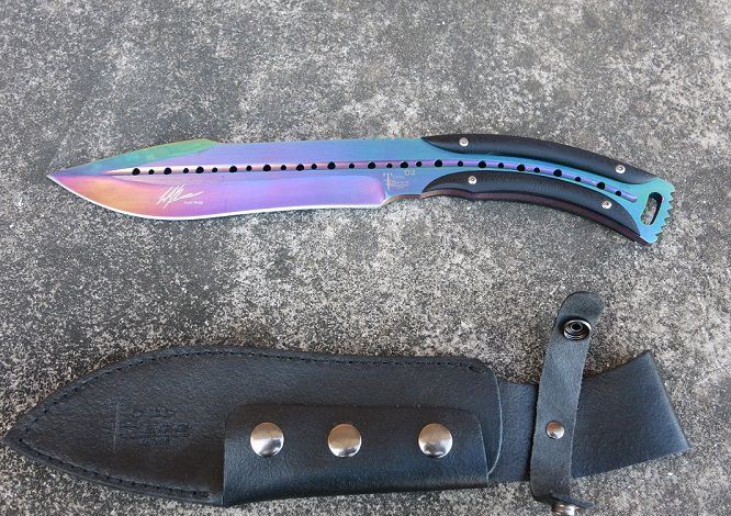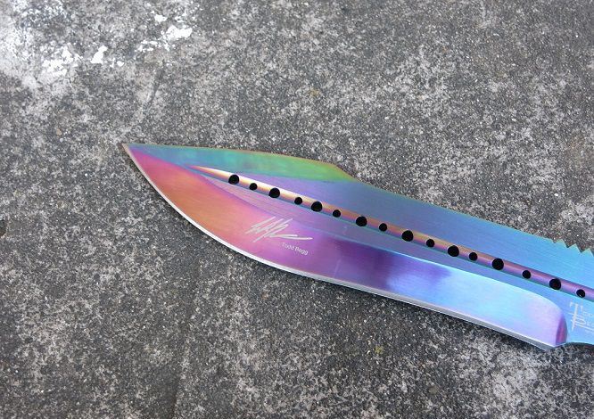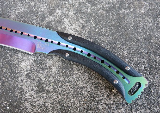 托德.贝格美人鱼彩钛版 全 长:330mm 刃 长:180mm 柄 长:120mm 刃 宽:51mm 刃 厚:6.4mm 刃 材:7Cr17Mov 重 量:550g(含包装) 硬 度:58HRC 表 面:钛金 柄 材:钢一体柄+G10条 锁 型:定锁