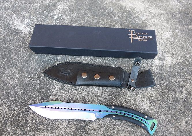 托德.贝格美人鱼彩钛版 全 长:330mm 刃 长:180mm 柄 长:120mm 刃 宽:51mm 刃 厚:6.4mm 刃 材:7Cr17Mov 重 量:550g(含包装) 硬 度:58HRC 表 面:钛金 柄 材:钢一体柄+G10条 锁 型:定锁 其 他:配牛皮套+牛皮纸盒