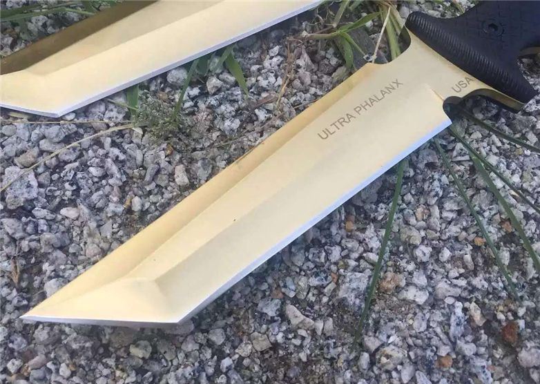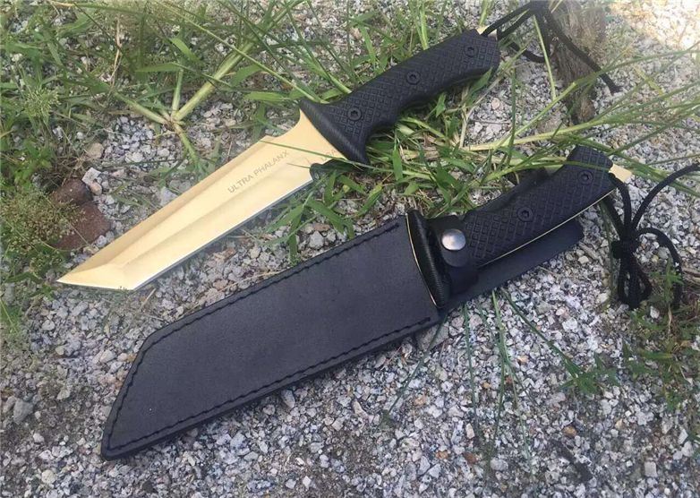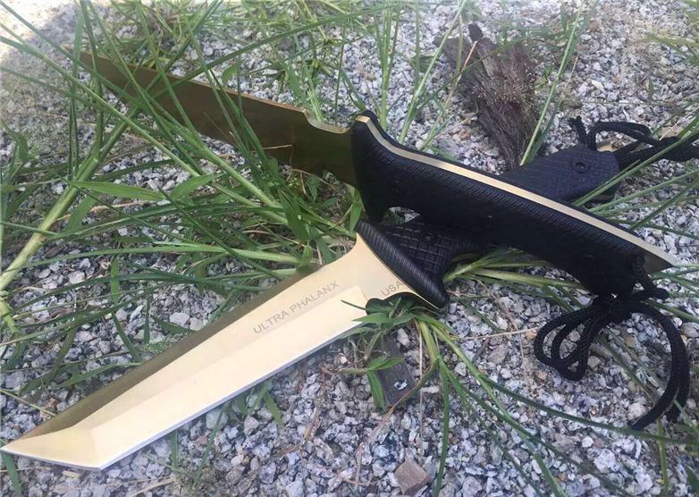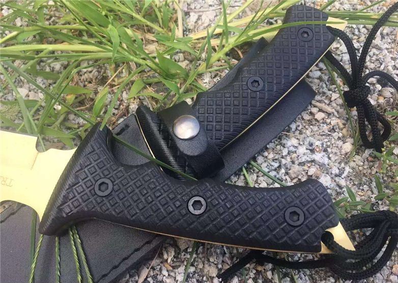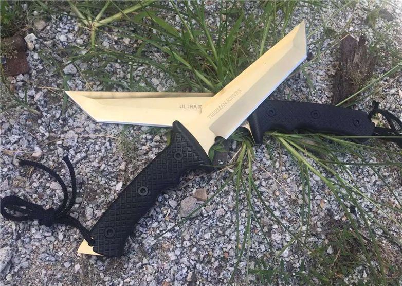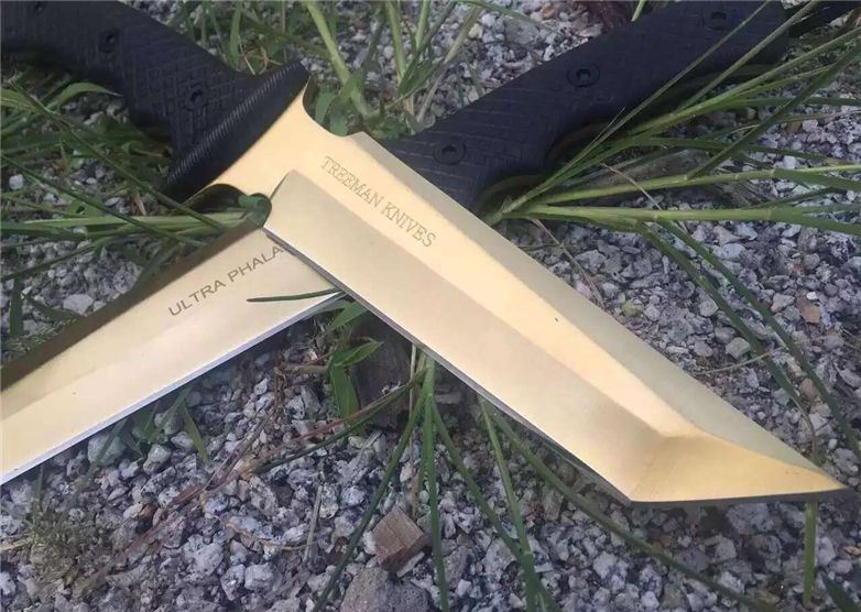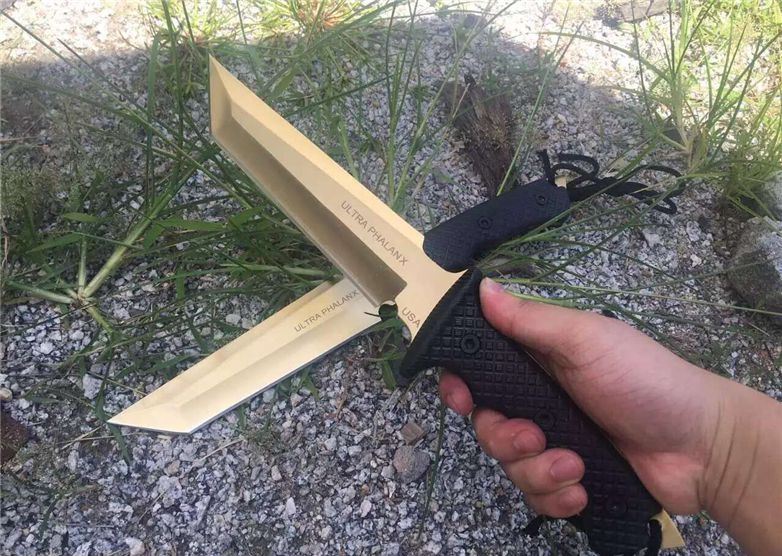 美国树人钛金恐怖矩阵战术直刀 全长:34.2 CM 刃长:18.5CM 刃厚:05.2mm 刃宽:4.1 CM 硬度:58-59 HRC 刃材:7cr17mov 柄材:G10防滑纹 附件:皮套 重量:545克(带皮套) 表面:钛金