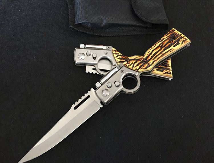 AK47枪型仿骨柄跳刀(带灯) 全长:25.1cm 刃长:11.2cm 刃宽:2.5cm 刃厚:0.23cm 柄长: 13.5cm 刃材:440 硬度:56HRC 总重量:123g(含包装物) 刃材料:不锈钢 柄材料:塑料胶+钢架 特色跳刀,整刀由缩小型AK47构成,自动折刀(侧跳) 附带有小电筒,非常实用!