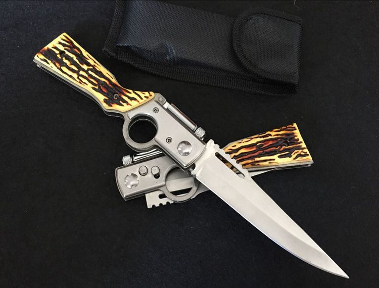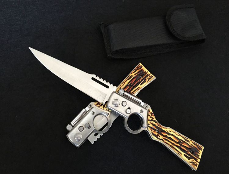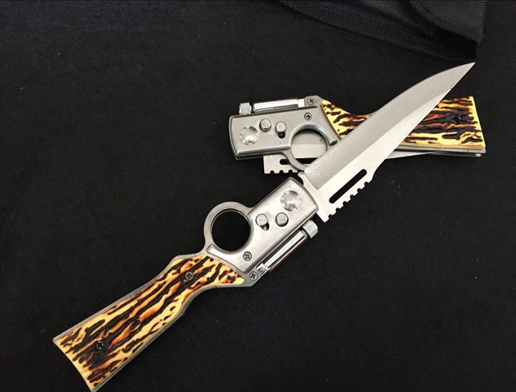 AK47枪型仿骨柄跳刀(带灯) 全长:25.1cm 刃长:11.2cm 刃宽:2.5cm 刃厚:0.23cm 柄长: 13.5cm 刃材:440 硬度:56HRC 总重量:123g(含包装物) 刃材料:不锈钢 柄材料:塑料胶+钢架