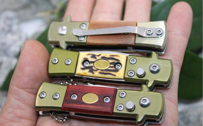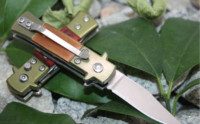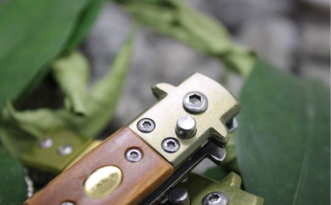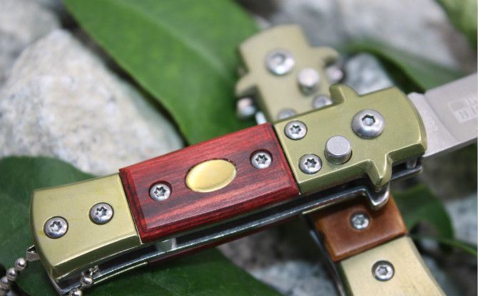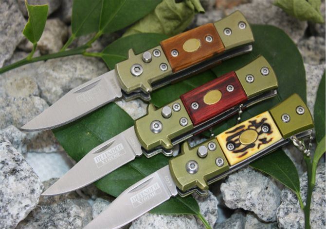 6402号防御者折刀(红影、白影木柄、防骨柄) 全 长: 12cm 柄 长:7cm 刃 刃 长: 5cm 刃 宽: 1.3cm(最宽处) 闭 合: 7cm 硬 度: 55HRC 刃 厚: 0.18cm 净 量: 50克 表 面: 砂光 柄 材: 木柄+钢头 锁 闭: 自动折刀(侧跳)
