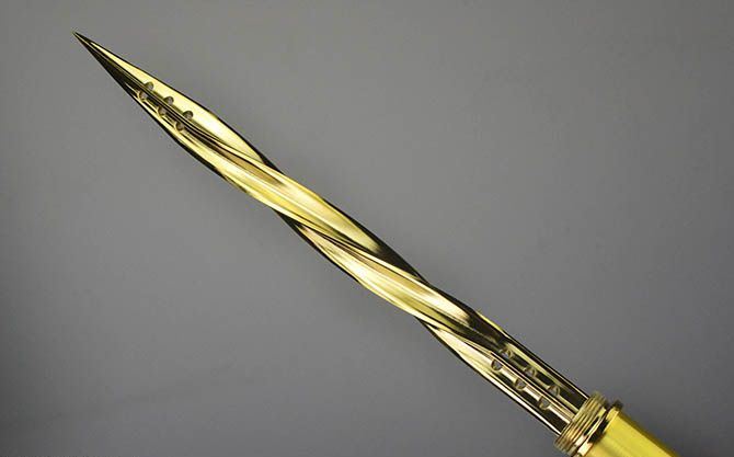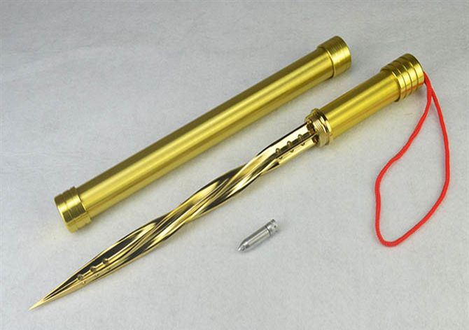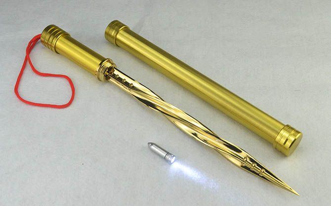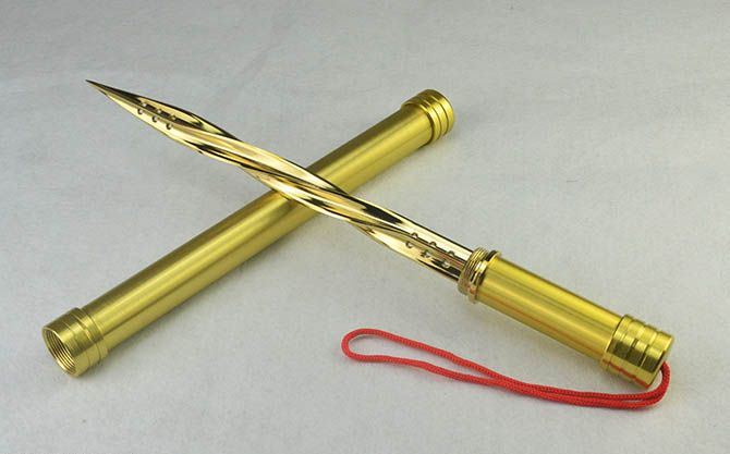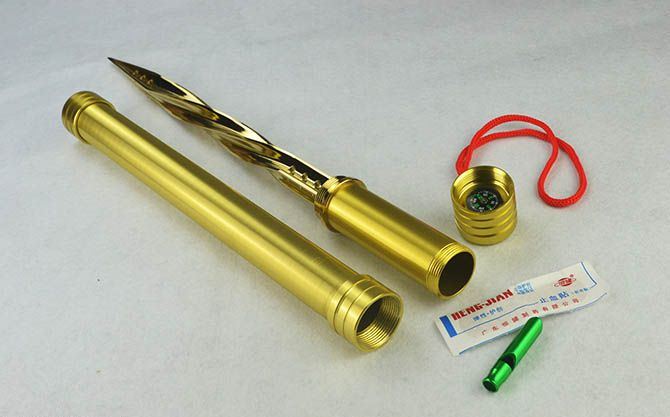 黄金扭纹四棱刺 正合长度:43.8CM 完全反驳长度:71.5CM 刃 长:30CM 管 径:3CM 柄 长:10.9CM 完全拼合柄长:40CM 重 量: 900g(含包装) 硬 度: 56HRC 刀材质:全钢 表面处理:土豪金 柄 材: 钢管