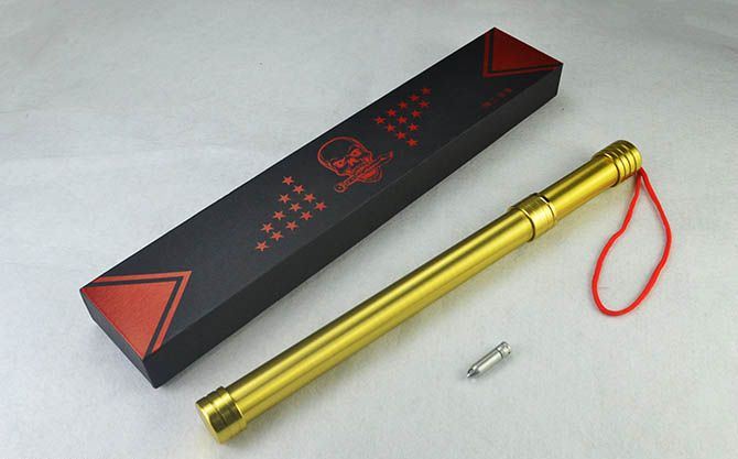 黄金扭纹四棱刺 正合长度:43.8CM 完全反驳长度:71.5CM 刃 长:30CM 管 径:3CM 柄 长:10.9CM 完全拼合柄长:40CM 重 量: 900g(含包装) 硬 度: 56HRC 刀材质:全钢 表面处理:土豪金 柄 材: 钢管 包 装:带高档纸盒