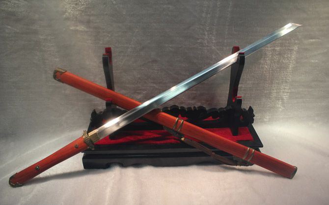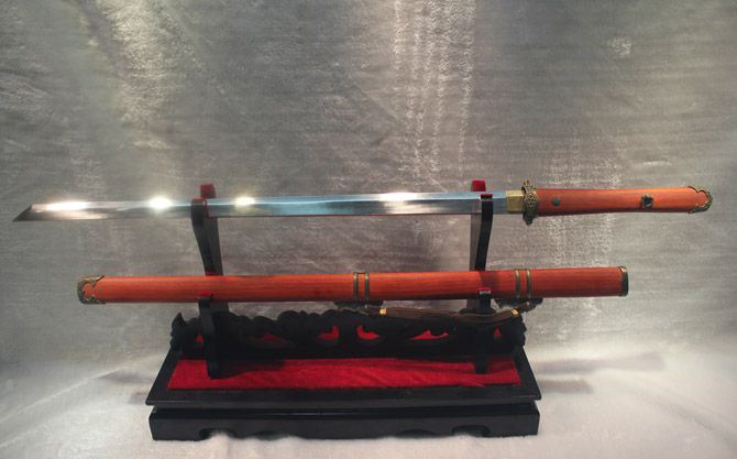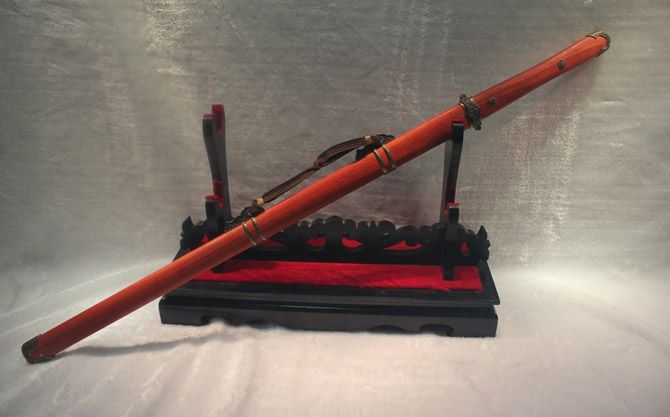 红木唐刀(长款) 全长 (cm):102 刃长(cm):77 柄长 (cm):23 全重(g):1.400 鞘重(g):420 刃宽(cm):3.2 刃厚(cm) :0.75 刃材: 高碳钢 鞘材: 红木 装材: 合金 柄材: 红木 硬度:58 性能:全开刃,削纸断竹砍铁 加工工艺:精炼地基钢,手工锻打,传统古法研磨。13道研磨 备注:手工产品存在误差,规格仅供参考,请以实物为准