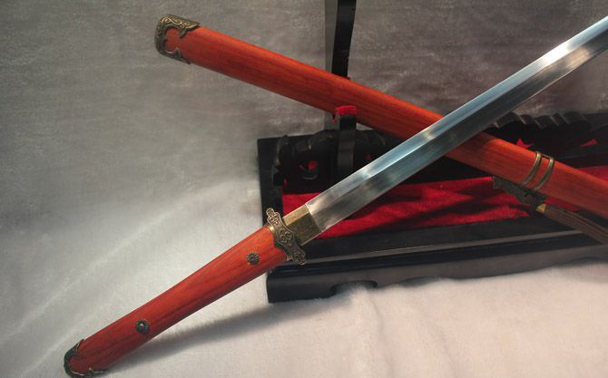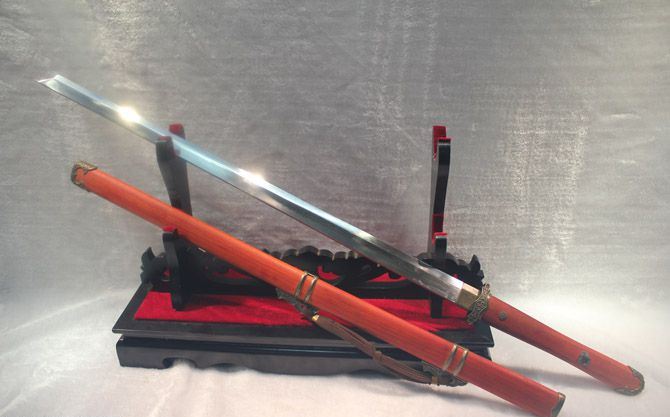 全长 (cm):102 刃长(cm):77 柄长 (cm):23 全重(g):1.400 鞘重(g):420 刃宽(cm):3.2 刃厚(cm) :0.75 刃材: 高碳钢 鞘材: 红木 装材: 合金 柄材: 红木 硬度:58 性能:全开刃,削纸断竹砍铁 加工工艺:精炼地基钢,手工锻打,传统古法研磨。13道研磨 备注:手工产品存在误差,规格仅供参考,请以实物为准