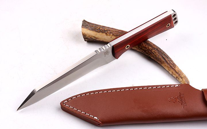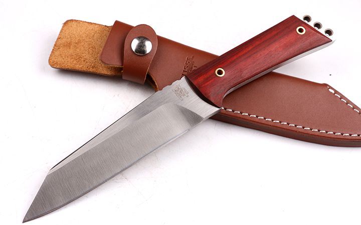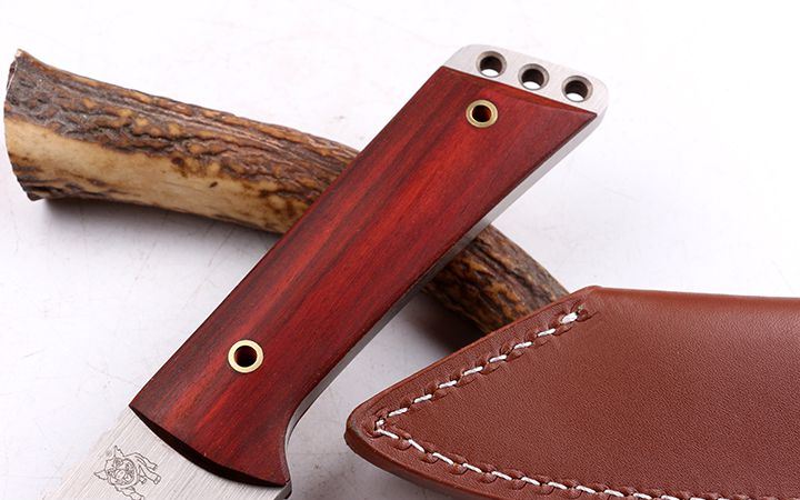 全 长: 26.5cm 刃 长: 14.5cm 柄 长: 12 刃 材: 9CR18MOV 硬 度: 58 表 面: 金属拉丝伴沙光 刃 厚: 0.65cm 柄 材: 一体全钢手柄,两边爽天然科檀木 刀 重:320克 总 重: 850克 刀 鞘:高密真皮套 其 他: 刃口锋利,原厂包装