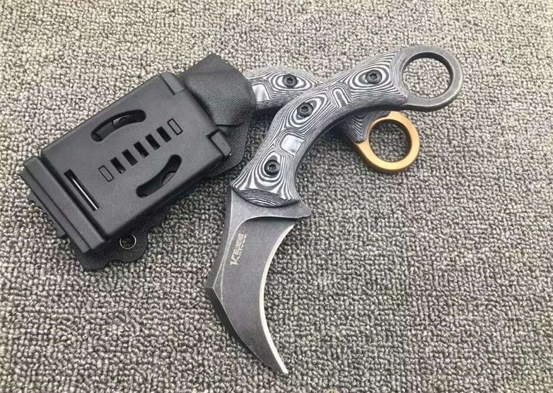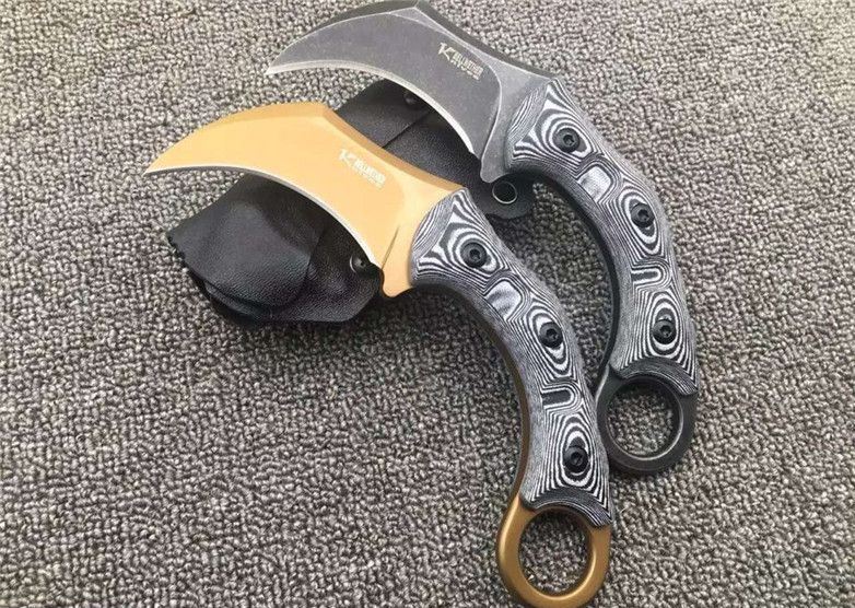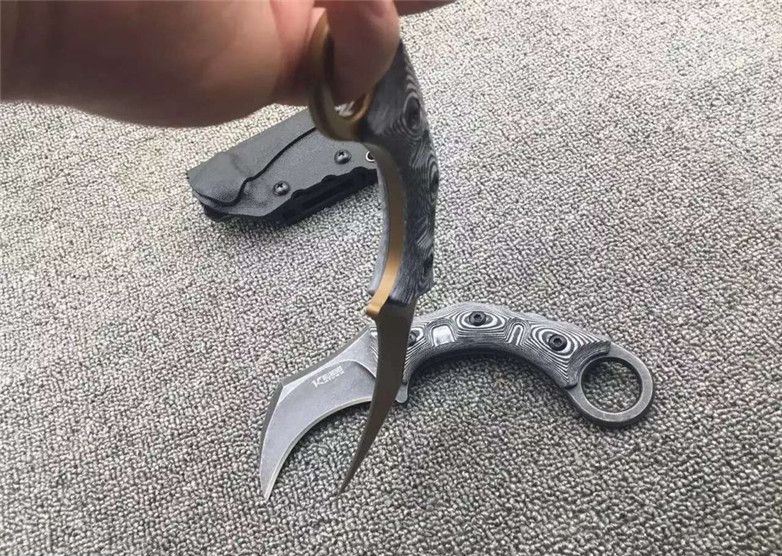 双雄魔兽爪刀 刃材:D2 柄材:黑白G10 全长:17.8厘米 刃长:6.8厘米 刃厚:0.55厘米 硬度:真空热处理58HRC 重量: 226克