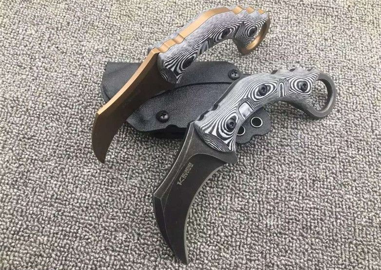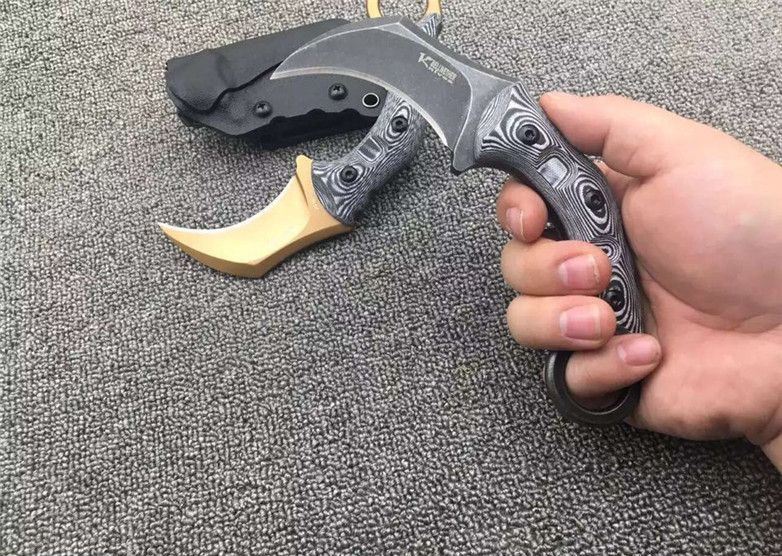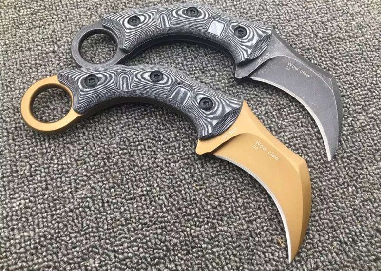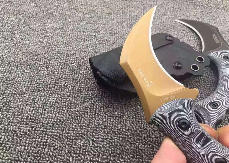 双雄魔兽爪刀 刃材:D2 柄材:黑白G10 全长:17.8厘米 刃长:6.8厘米 刃厚:0.55厘米 硬度:真空热处理58HRC 重量: 226克 表面处理:沧桑石洗,玫瑰金钛