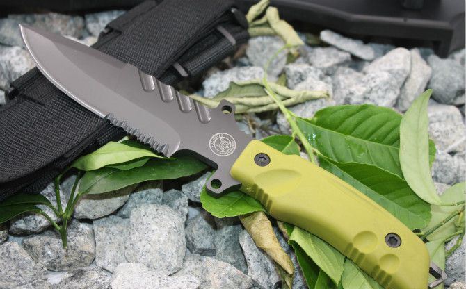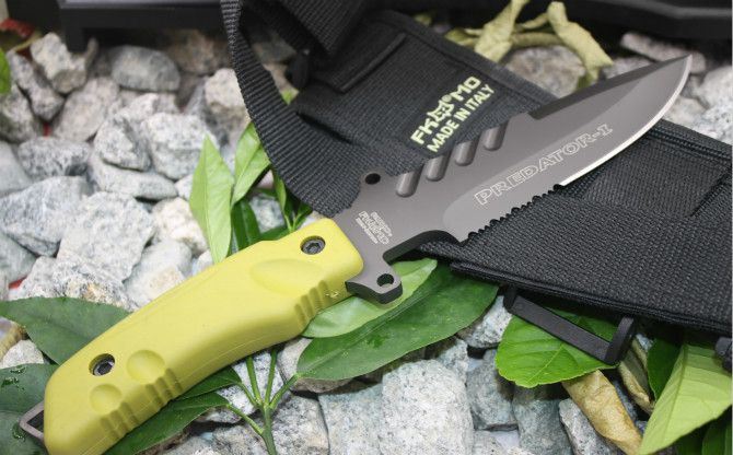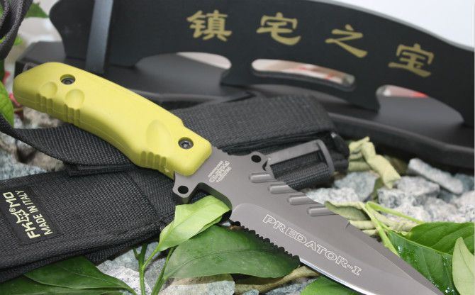 狐狸掠夺者格斗刀3号(灰钛黄柄) 全长:28.5cm 刃长:15.5cm 柄长:13cm 刃宽:4cm(最宽处) 刃厚:0.57cm 刃材:440C 硬度:57HRC 表面:镀钛 柄材:ABS 总重:520克(含刀套和包装物) 附件:尼龙刀套