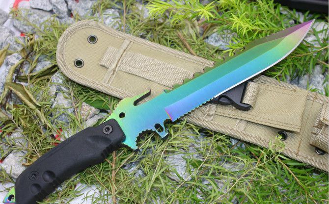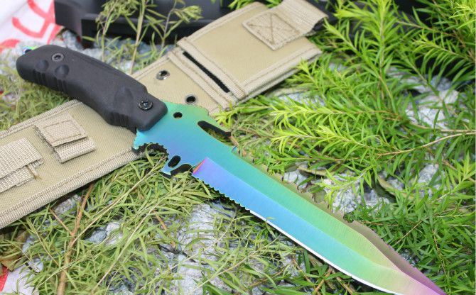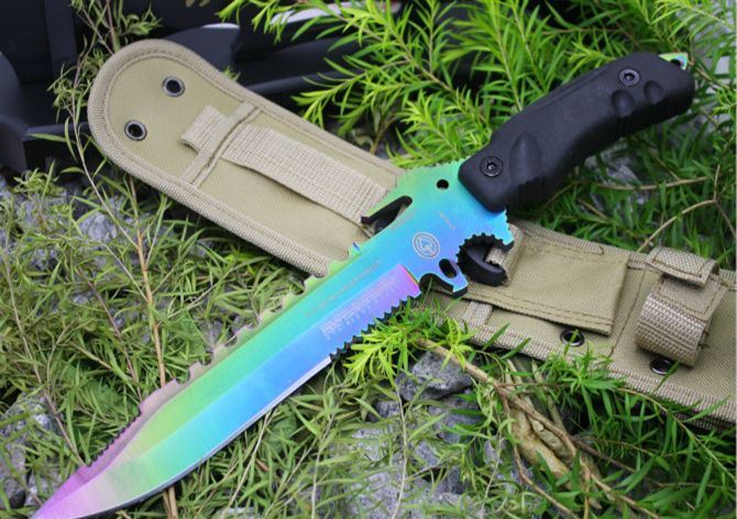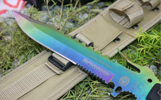 彩钛夜魔911直刀(黑色柄) 全 长:355mm 刃 长:180mm 柄 长:130mm 刃 宽:35mm 刃 厚:6.3mm 刃 材:5Cr13Mov 重 量:520g(含包装) 硬 度:57HRC 表 面:彩钛版 柄 材:ABS塑胶 锁 型:定锁
