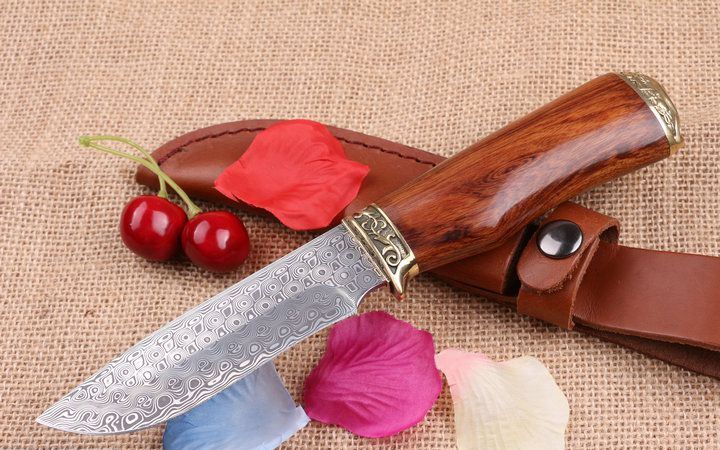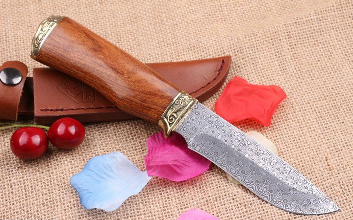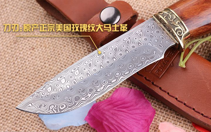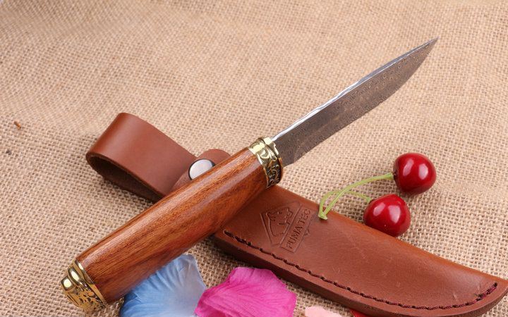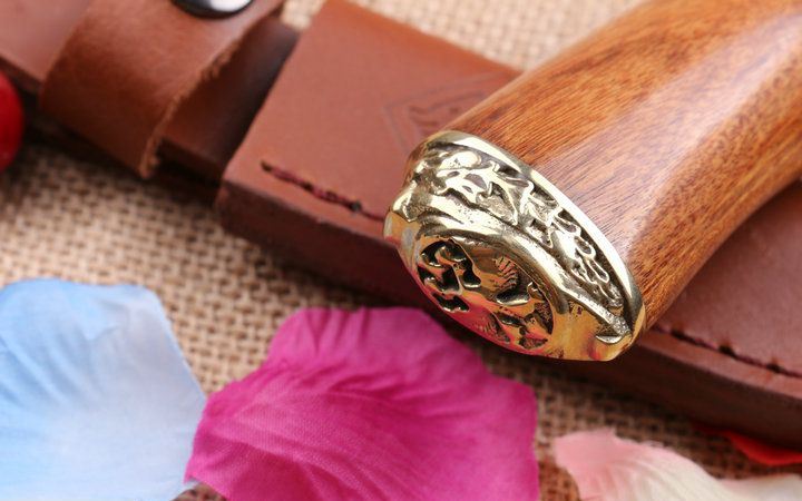 至尊大马士革手工小猎刀 全 长: 23.0cm 刃 长: 11.3cm 柄 长: 11.8cm 刃 厚: 2.8mm 刃 材: 进口大马士革 硬 度: 58HRC 总 重: 270克 净 重: 175克 表 面: 大马士革原有纹 柄 材: 雕纹黄铜钢头+天然酸枝木,高档漂亮 刀 鞘: 皮套 其 它: 刀口锋利.手工制作.值得收藏