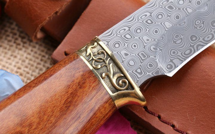 至尊大马士革手工小猎刀 全 长: 23.0cm 刃 长: 11.3cm 柄 长: 11.8cm 刃 厚: 2.8mm 刃 材: 进口大马士革 硬 度: 58HRC 总 重: 270克 净 重: 175克 表 面: 大马士革原有纹 柄 材: 雕纹黄铜钢头+天然酸枝木,高档漂亮 刀 鞘: 皮套