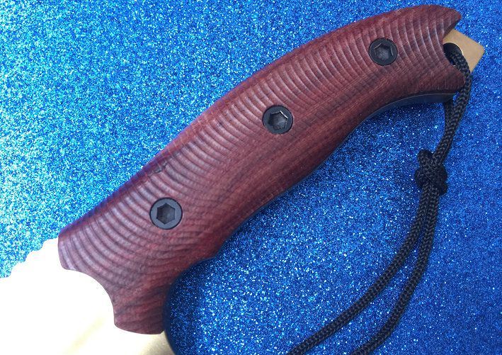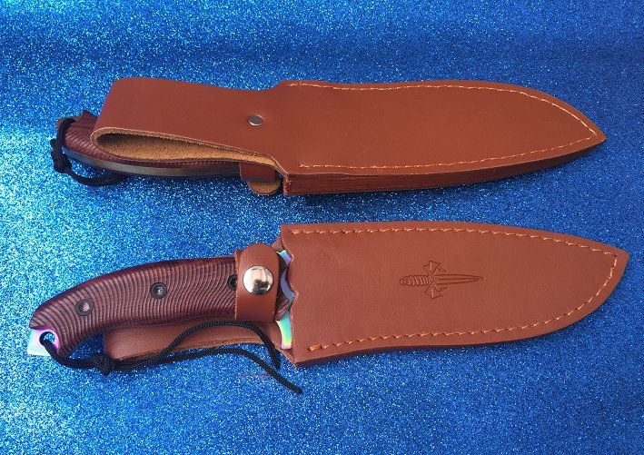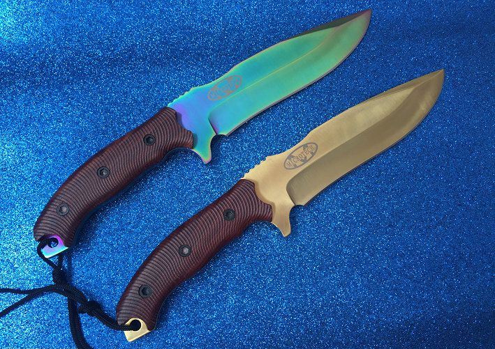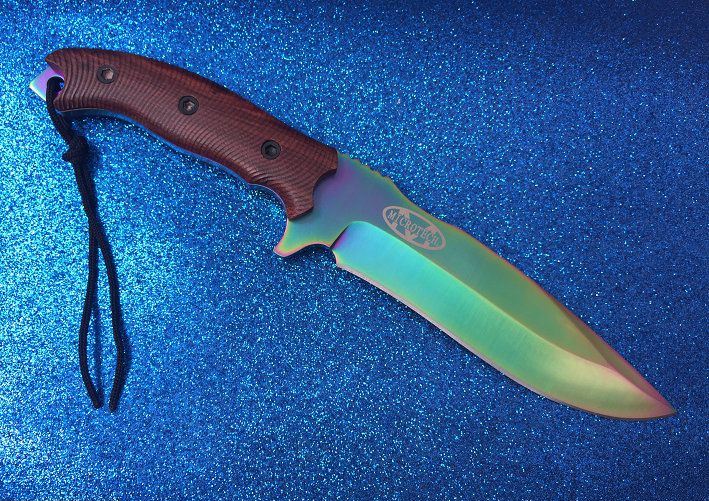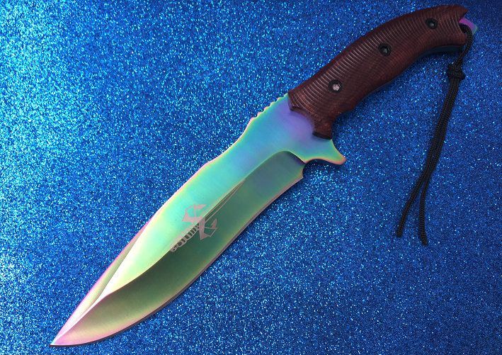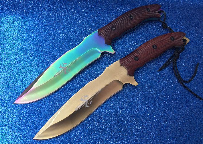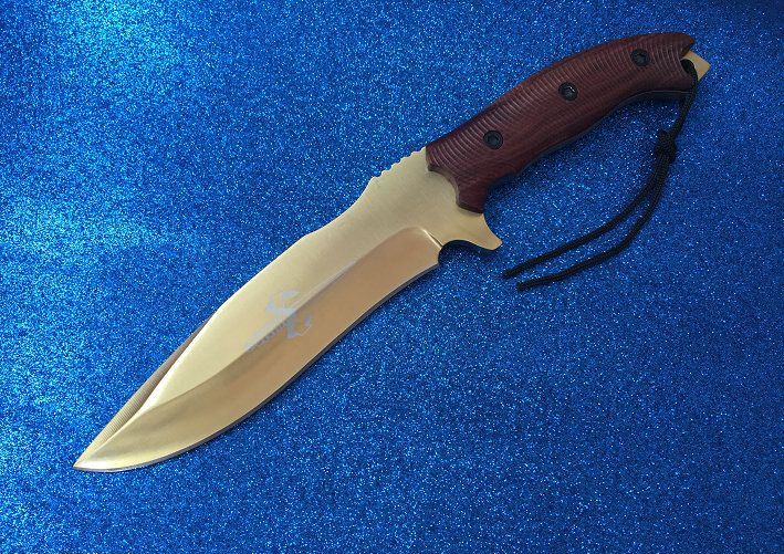微技术先行者战术直刀 全长:29.5cm 刃长:17cm 柄长:12.5cm 刃厚:6mm 刃宽:3.8cm 刃材:8Cr13 柄材:花枝木 硬度:59HRC 净重:约345克 表面处理:彩钛和金钛