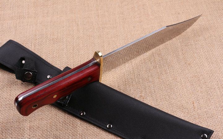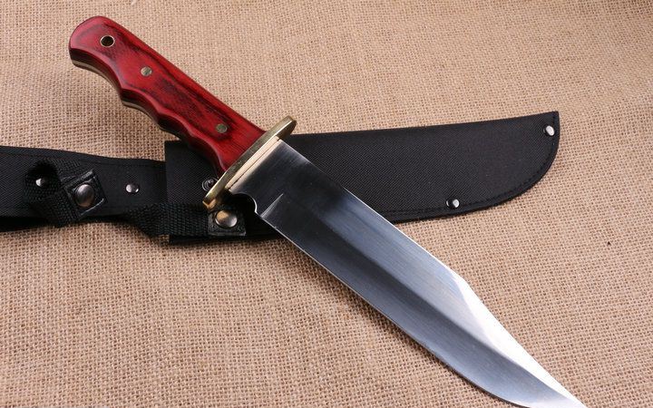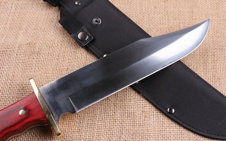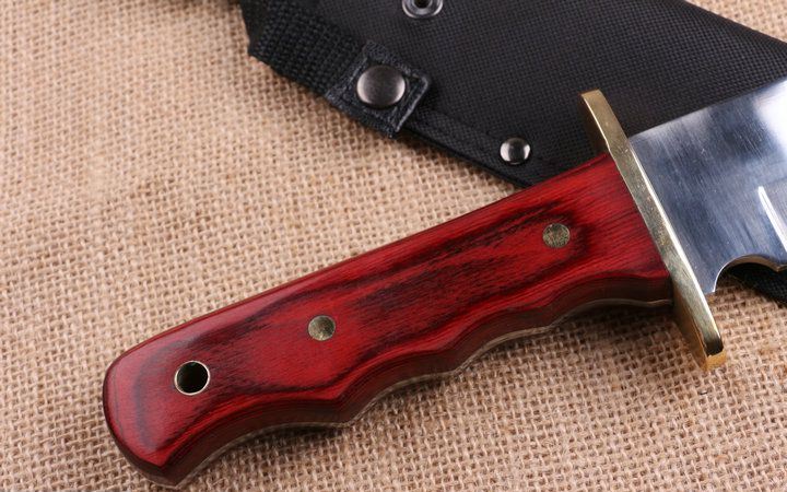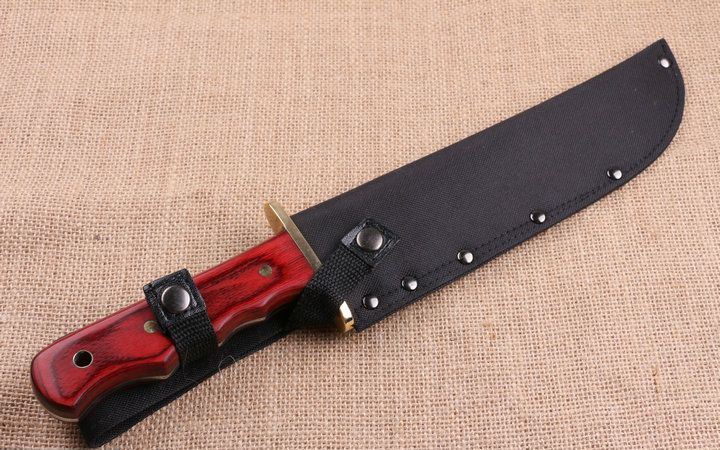 红蟒猛兽新品直刀 全 长:351mm 刃 长:218mm 柄 长:133mm 刃 宽:43mm 刃 厚:4.0mm 刃 材:7Cr17 重 量:518g(含包装) 硬 度:58HRC 表 面:拉沙+镜光 柄 材:铜头护手+大红木 其 他:配优质牛津套