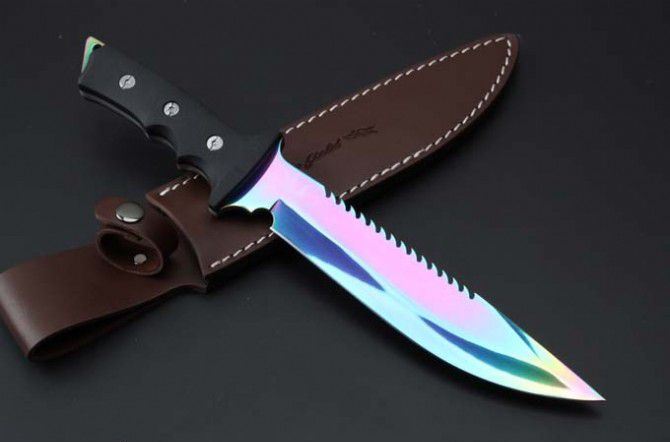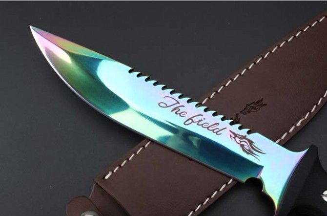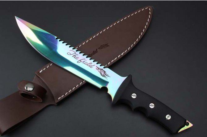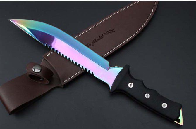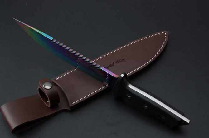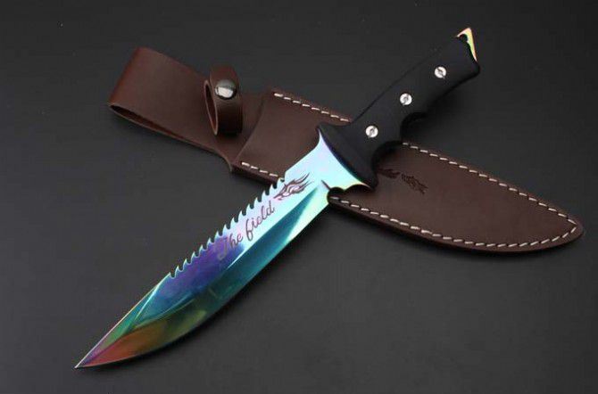 野战狼复仇直刀(彩钛版) 全 长:355mm 刃 长:222mm 柄 长:135mm 刃 宽:40mm 刃 厚:5.8mm 刃 材:8Cr18Mov 重 量:896g(含包装) 硬 度:58HRC 表 面:镜光彩钛 柄 材:黑色G10 其 他:配牛皮套+硬纸盒