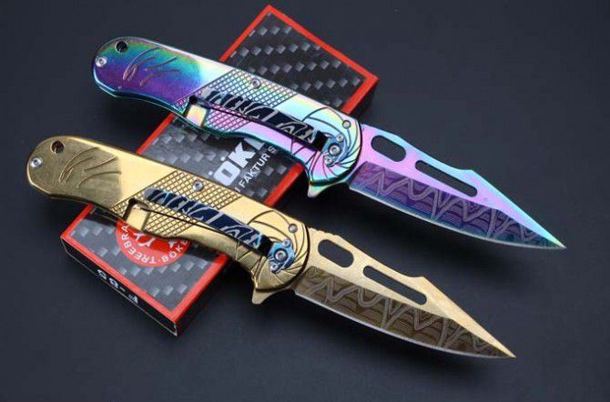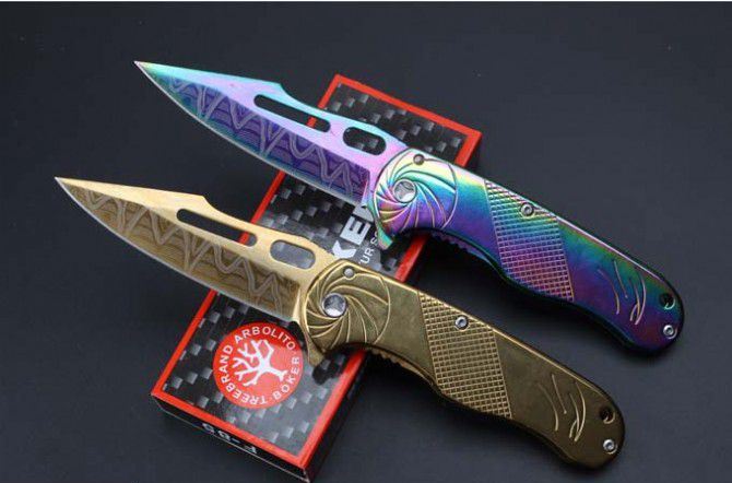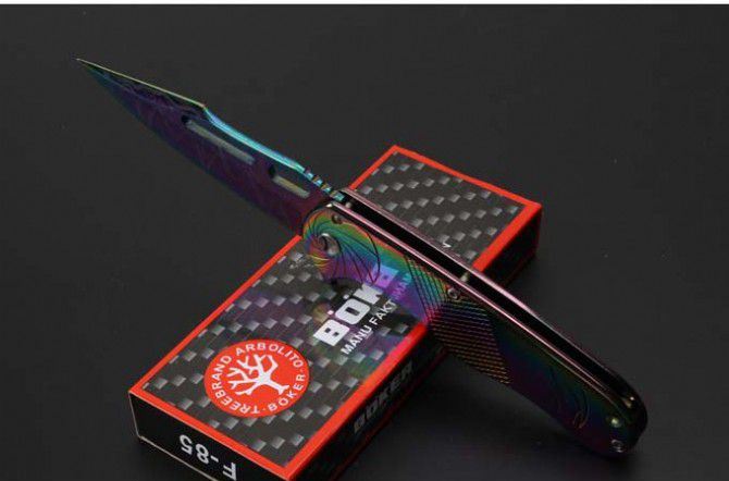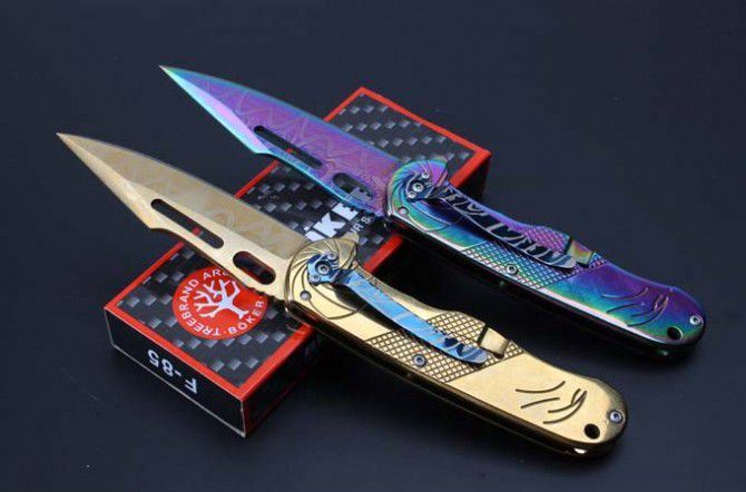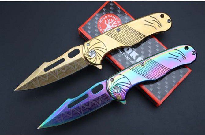 博克F85台风带轴承折刀(金色、彩钛) 全长:22.8cm 刃长:10.0cm 柄长:12.8cm 刃厚:0.36cm 刃宽: 2.9cm 刃材: 5CR15MOV 柄材:全钢镀金+彩钛两色任选,下单注明。 硬度: 56HRC 净重;260克 锁定;线锁 表面处:激光花纹