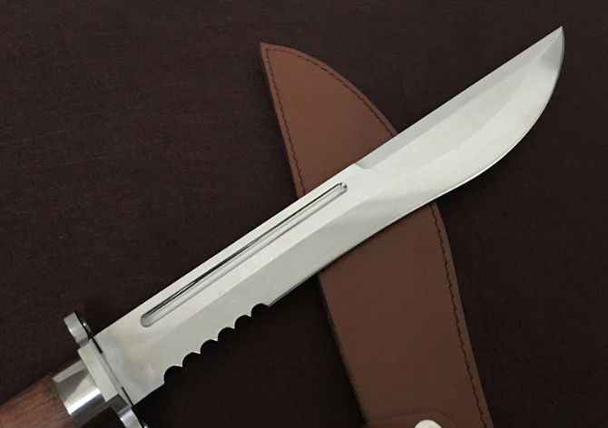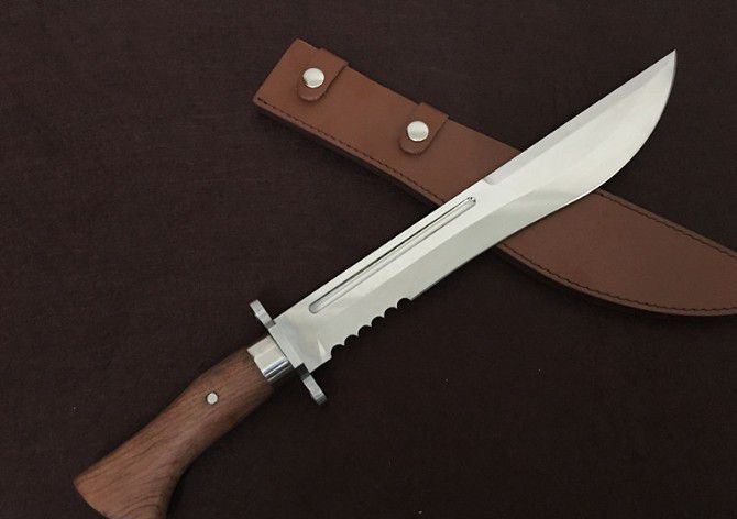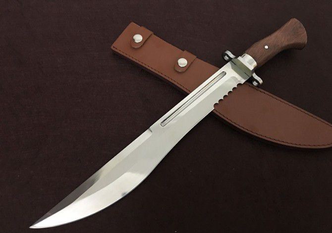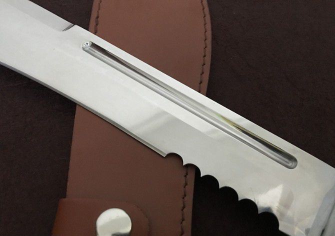 全 长:480mm 刃 长:350mm 柄 长:130mm 刃 宽:55mm 刃 厚:5mm 刃 材:优质8铬钢 重 量:900g 硬 度:58HRC 以上 表 面:沙光 柄 材:钢一体柄+双钢+非洲黄檀 其 他:配牛皮套