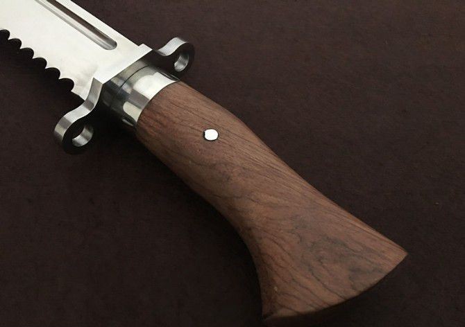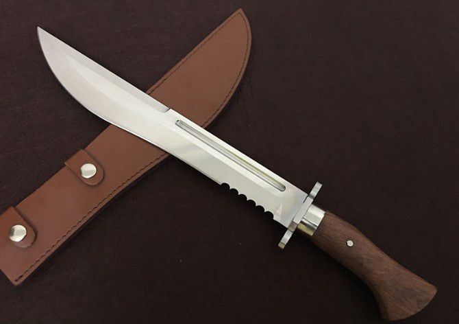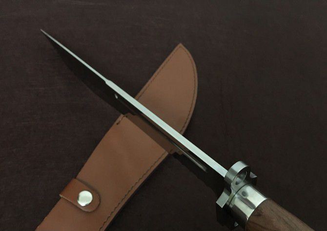 圣羽影风劲魔者镜光狗腿刀 全 长:480mm 刃 长:350mm 柄 长:130mm 刃 宽:55mm 刃 厚:5mm 刃 材:优质8铬钢 重 量:900g 硬 度:58HRC 以上 表 面:沙光 柄 材:钢一体柄+双钢+非洲黄檀 其 他:配牛皮套