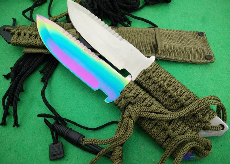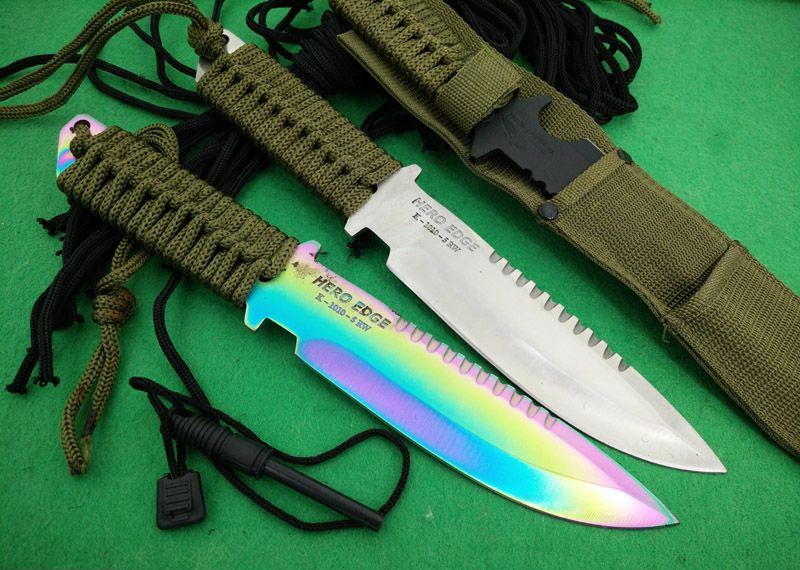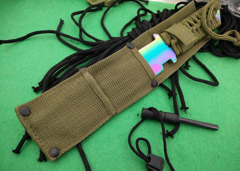Hero绑绳军刀救生刀(砂光、彩钛) 全长:29.3 刃长:17 刃厚:0.4 柄长:12.5 刃材料:3铬13不锈钢 重量:260克 Hero(英雄)绳柄军刀,一体龙骨结构,刀柄用伞绳编织而成,简单实用
