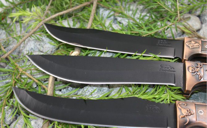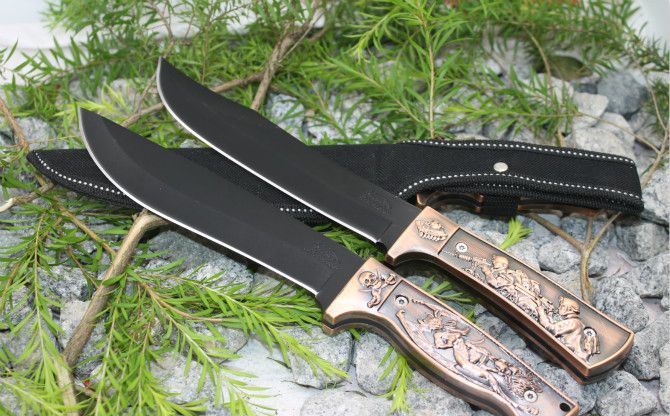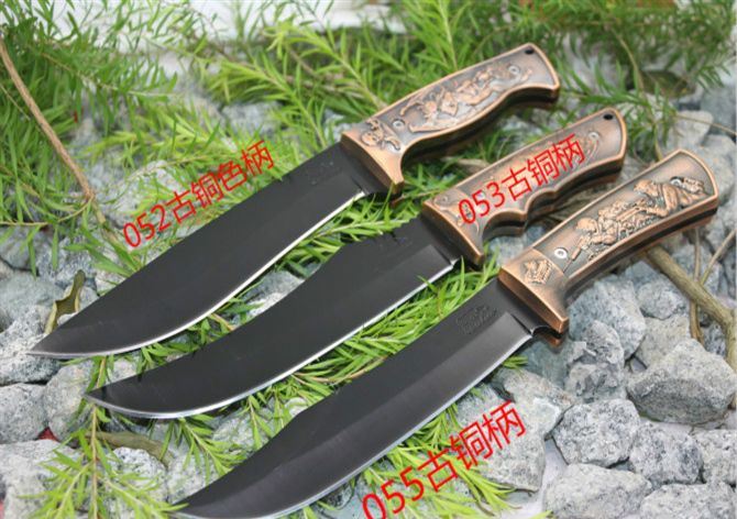 俄罗斯民族刀(052、053、055仿古柄) 全 长:30.5cm 刃 长:18.5cm 刃 宽:3.5cm(最宽处) 刃 厚:3.4mm 柄 长:11.5cm 表 面: 发黑 刃 材: 3CR13 硬 度: 57HRC 柄 材: 仿古铜 重 量: 300克(含包装)