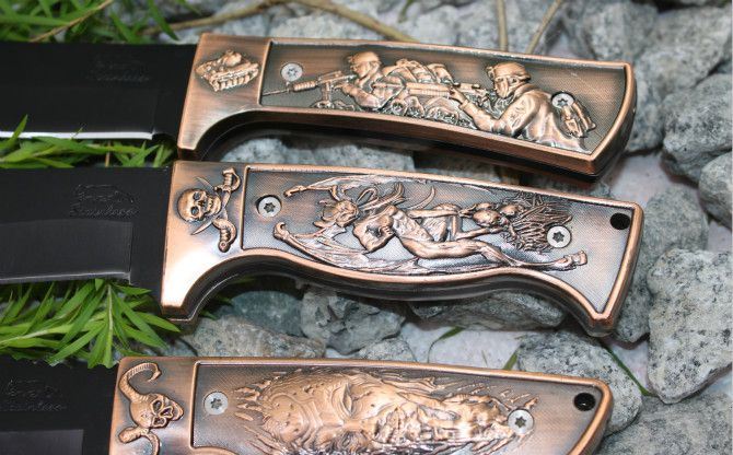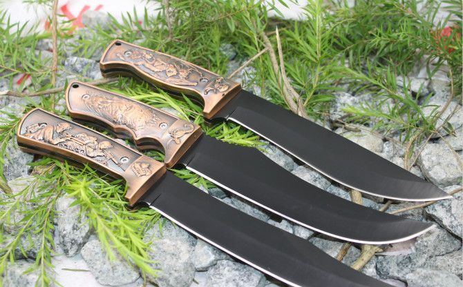 俄罗斯民族刀(052、053、055仿古柄) 全 长:30.5cm 刃 长:18.5cm 刃 宽:3.5cm(最宽处) 刃 厚:3.4mm 柄 长:11.5cm 表 面: 发黑 刃 材: 3CR13 硬 度: 57HRC 柄 材: 仿古铜 重 量: 300克(含包装) 包 装:尼龙套