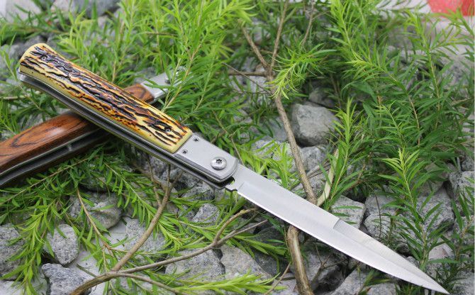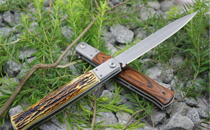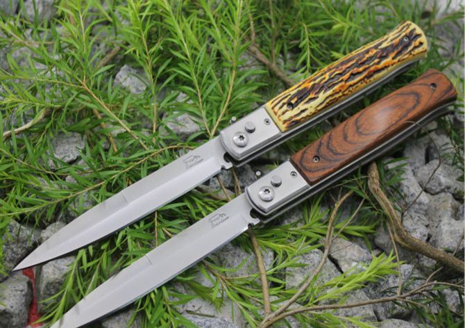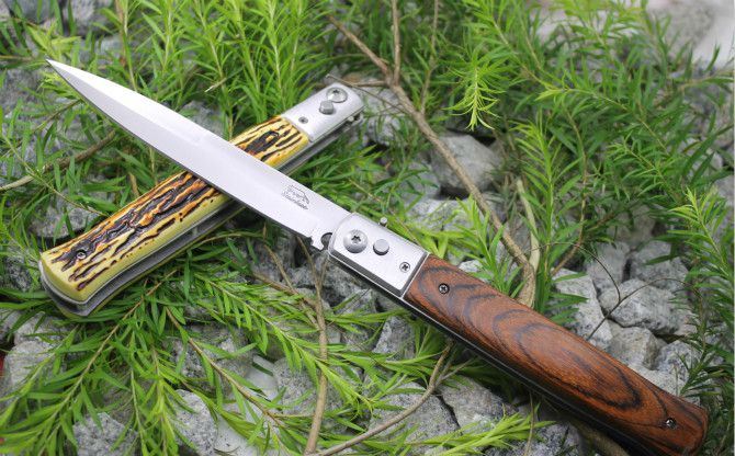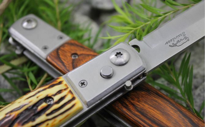 俄罗斯民族K01强力侧跳(彩木、仿骨柄) 全长:30CM 刃长:13CM 刃厚:0.23CM 刃宽:2CM 重量:200克 刃材:420不锈钢